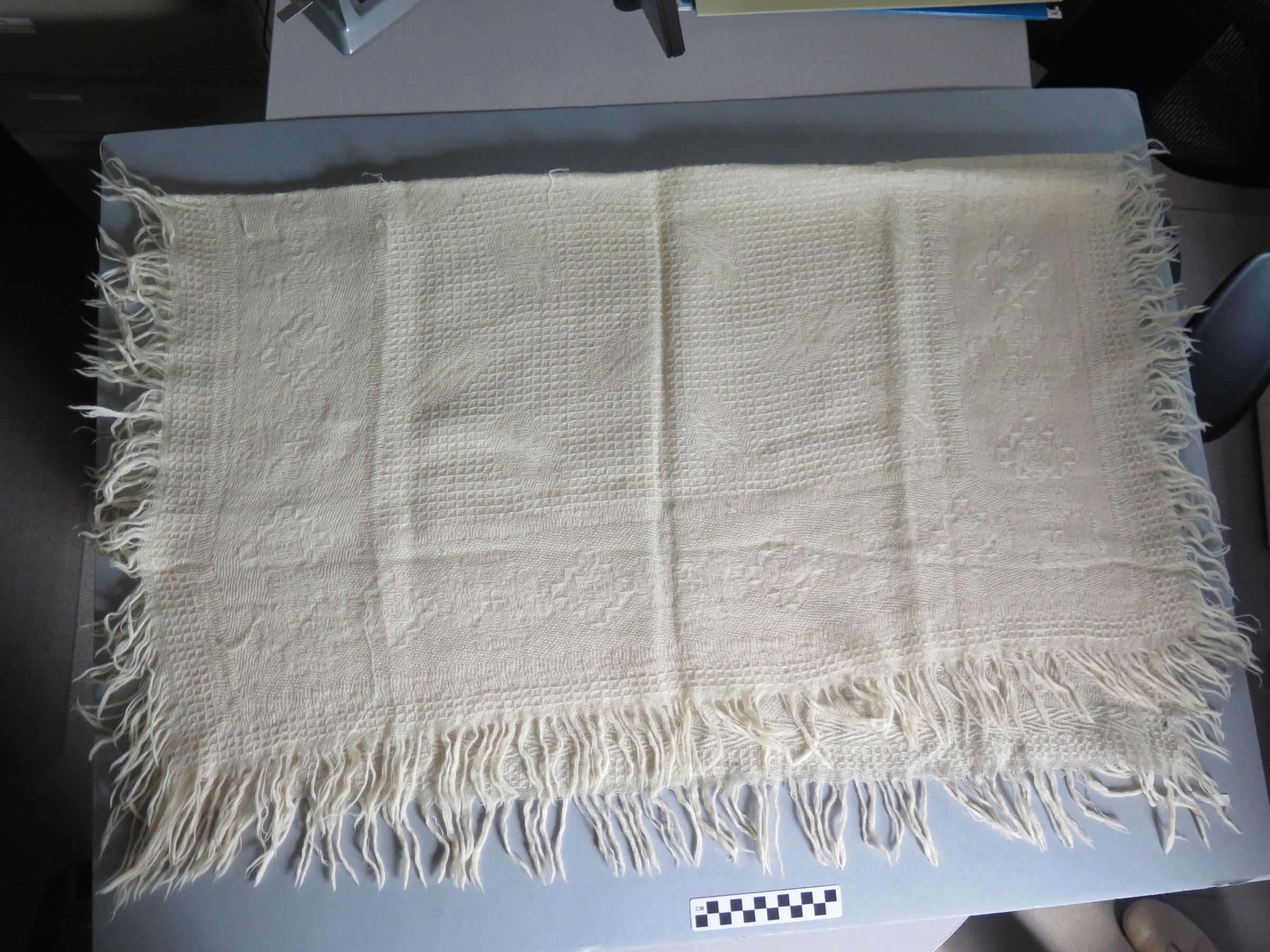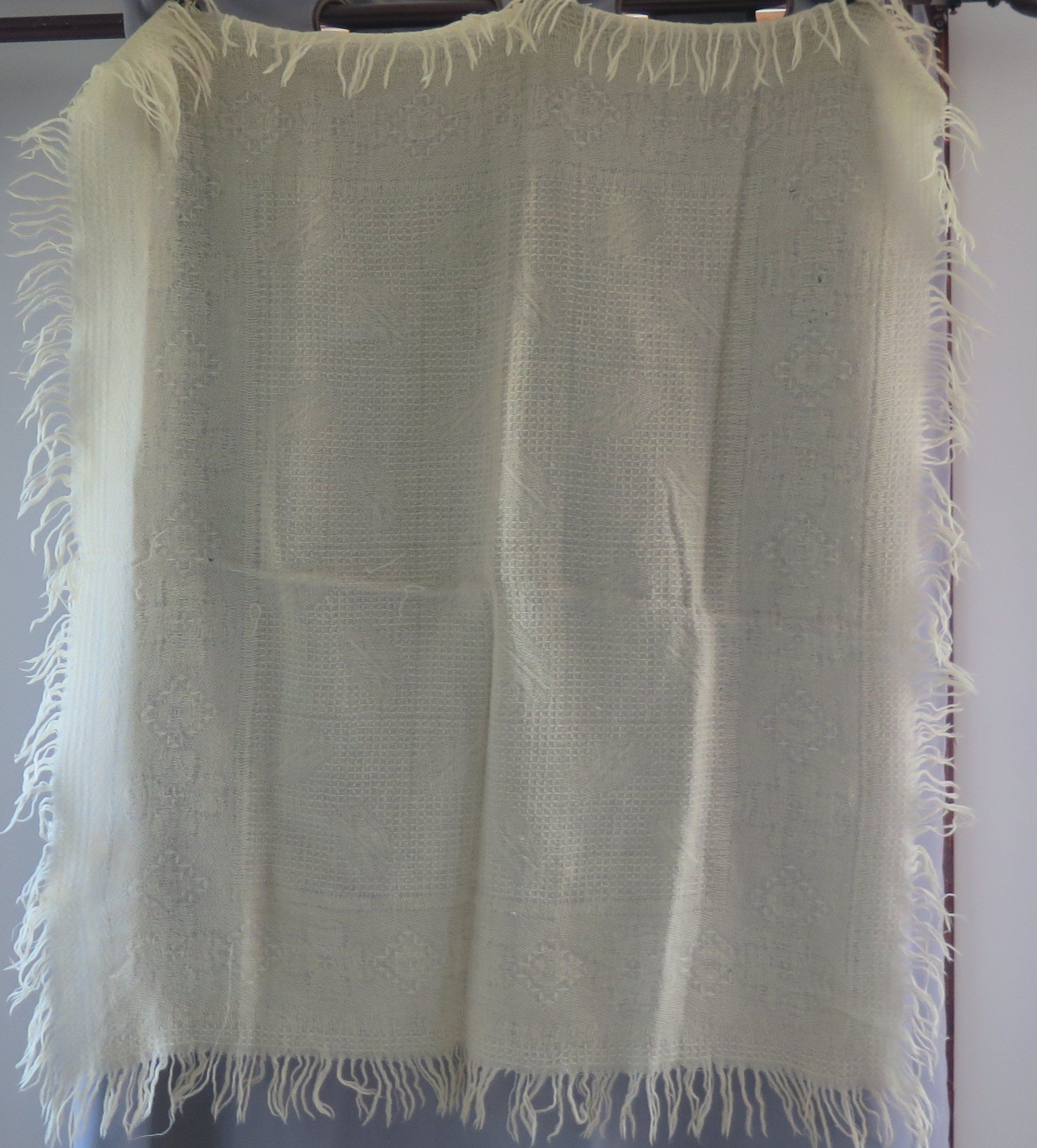 This is a beige colored baby blanket with fringe off all 4 sides. There is a grid pattern in the middle of the blanket and smaller designs around the border of the blanket. The blanket measures 32" (w) x 50" (l).