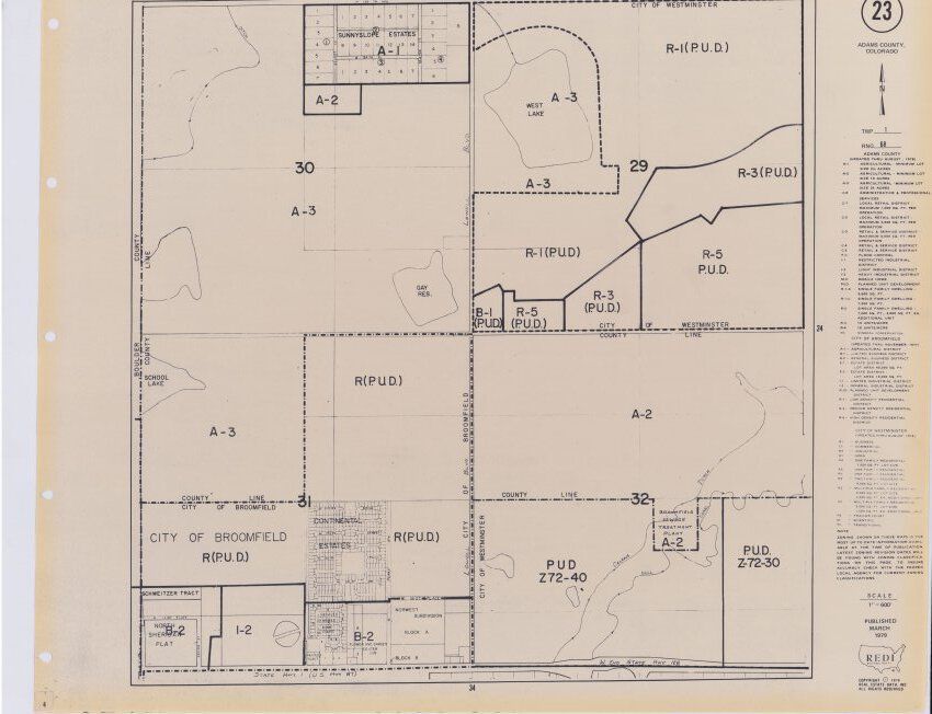 A property map of Adams County, Colorado. It has a scaleof 1"-600'. The map was originally published in 1979. Important landmarks on the map include State Highway 1 (US Highway 87), Lowell Blvd., the Broomfield Sewage Treatment Plant, Continental Estates, Sunnyslope Estates, West Lake, City Of Broomfield (PUD), and the City of Westminister.Collection