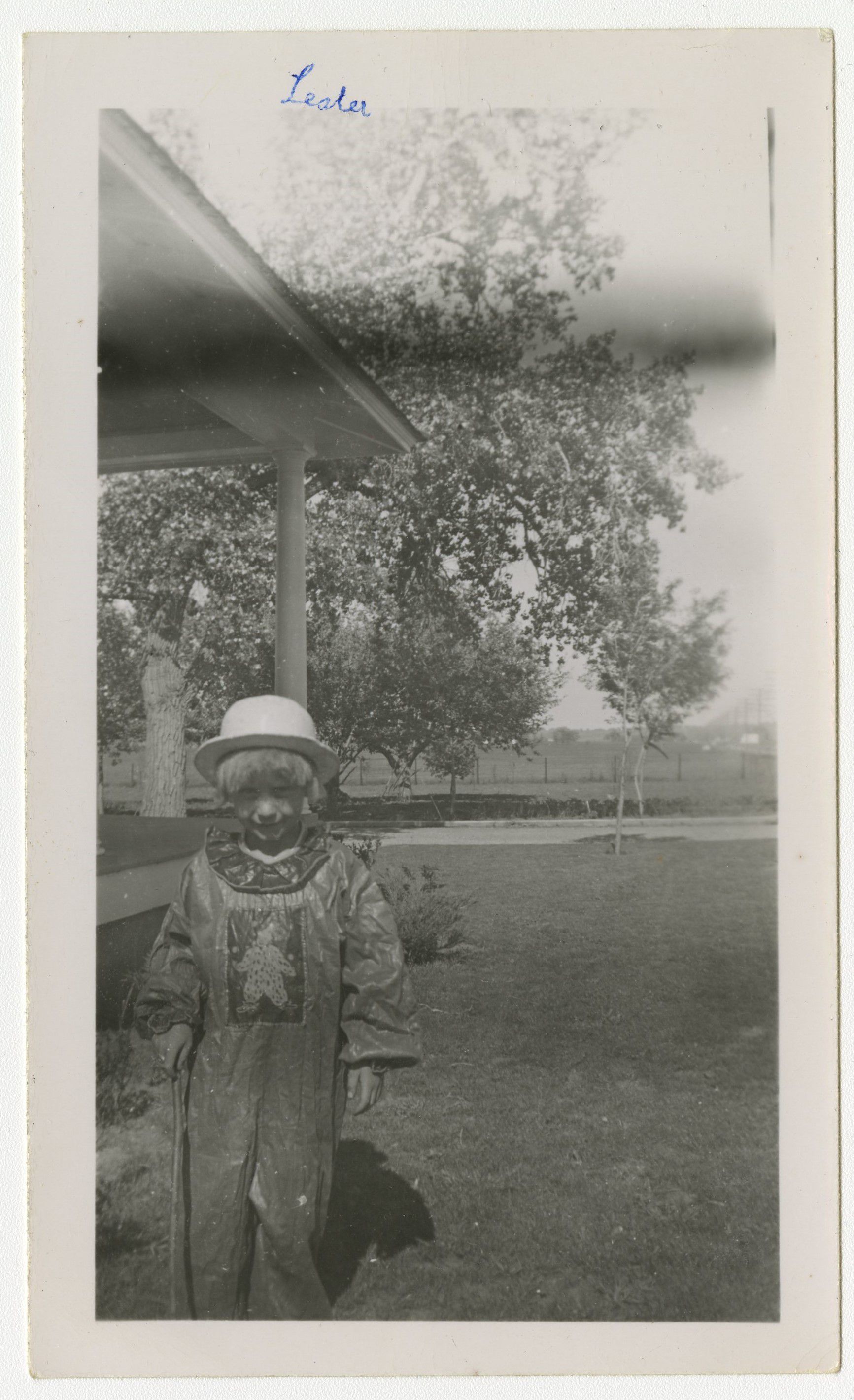 Black and white photograph of a young boy in a costume. The boy is Lester K. Brunner