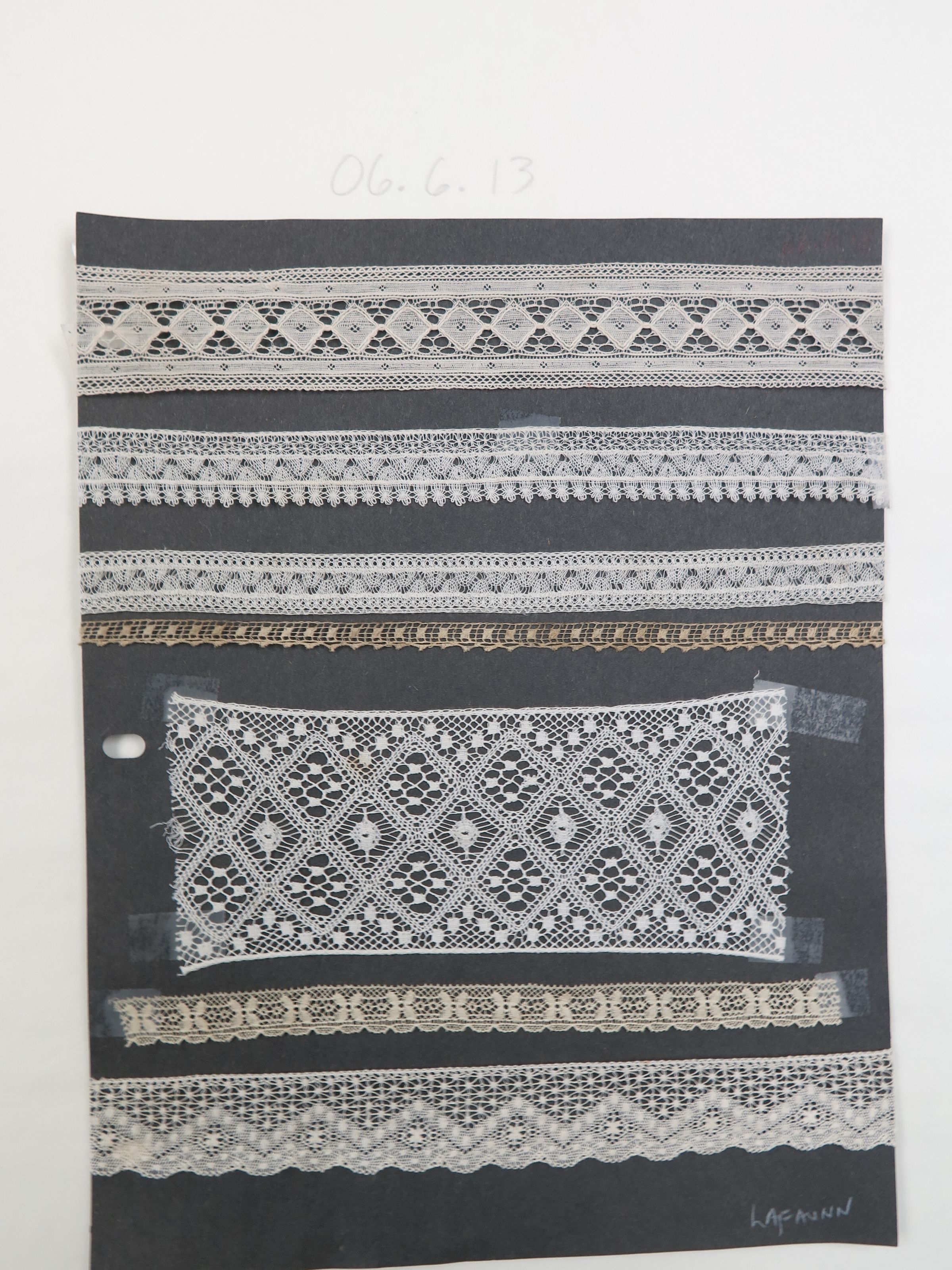 This is a set of lace samples on a black paper background. The samples are wrapped in plastic to keep the whole set together. The samples are almost all white, with only a couple of yellow examples.