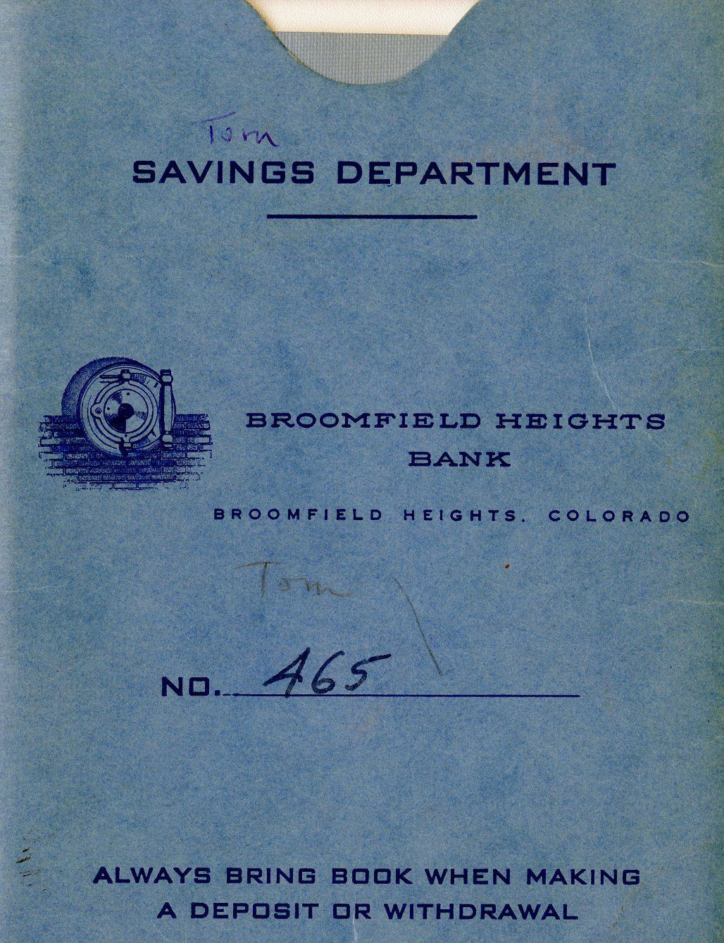 Little blue book with a sleeve for Tom James to keep track of his deposits and withdrawals.