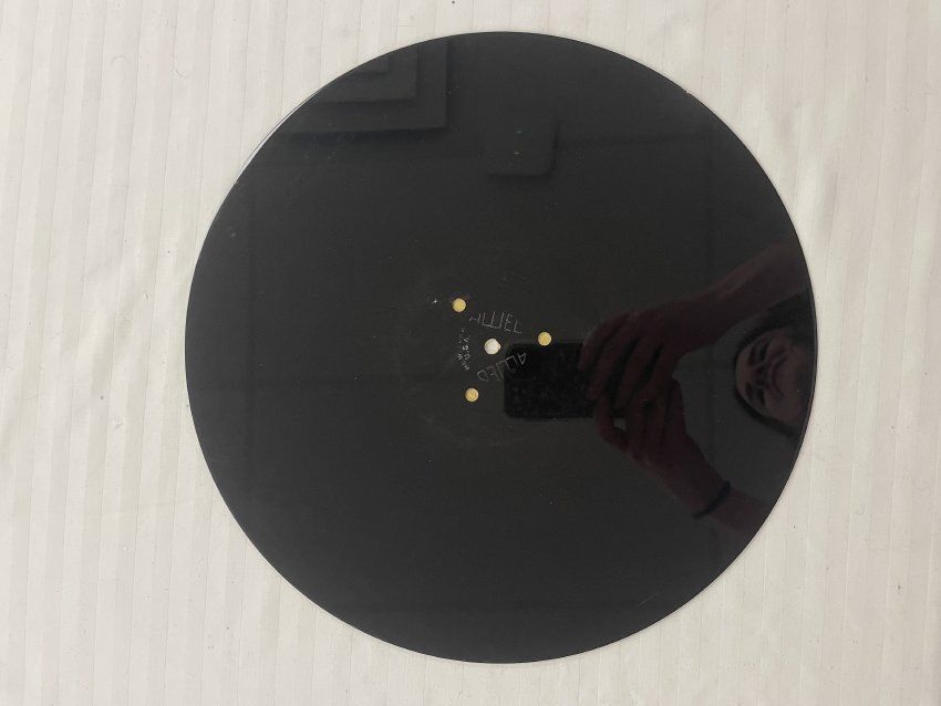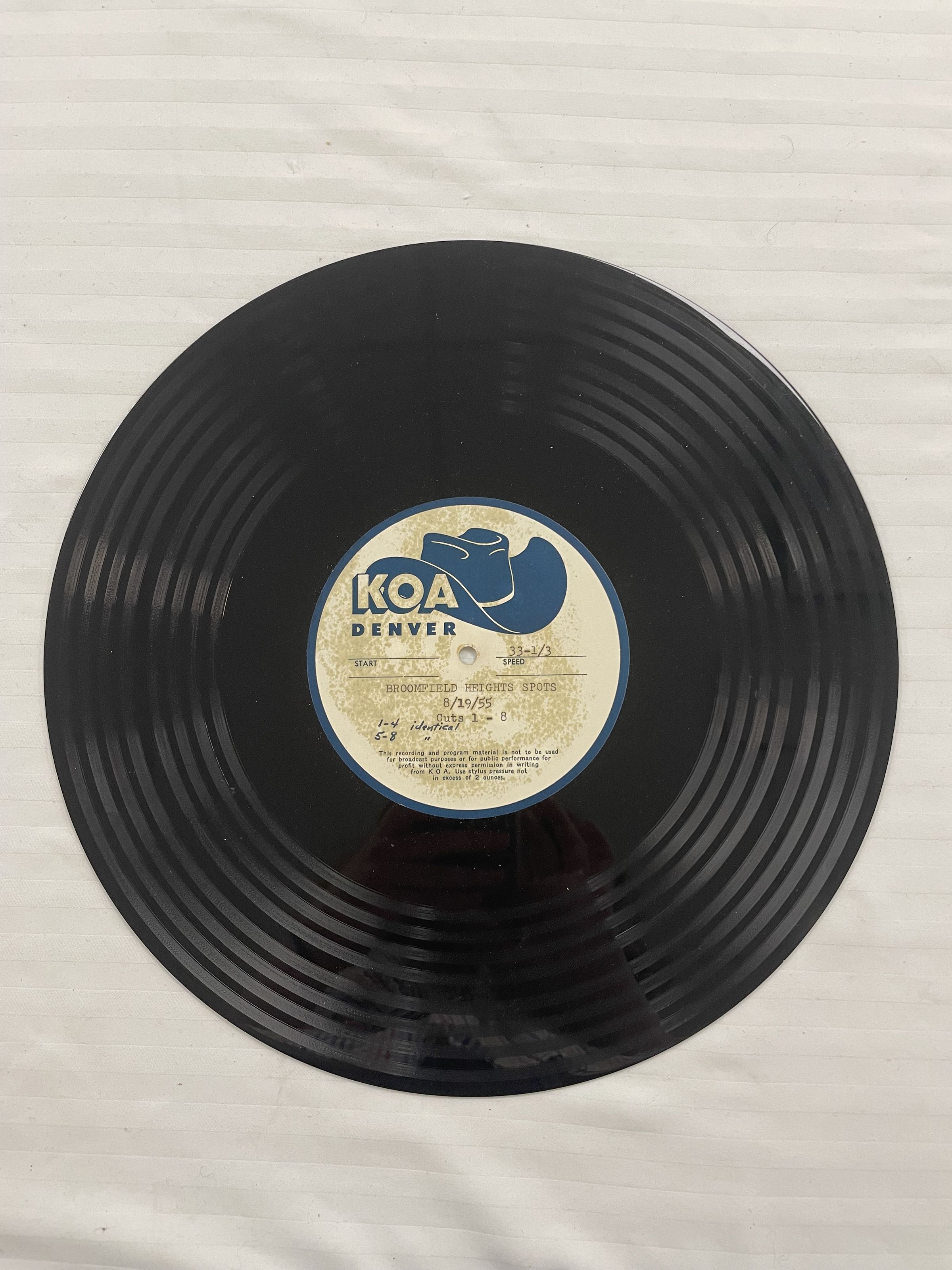 Vinyl Record likely containing Radio Ads/ Promo Piece for Broomfield Heights and the Turnpike Land Company. Labeled KOA Denver with a cowboy hat that is blue with 33 and 1/3 speed. Broomfield Heights Spots on 8/19/1955. Handwriting says Cuts 1-8, handwriting with 1-4 identical and 5-8 identical. Says made in New York, USA and "Allied".The other side does not have any recording on it.