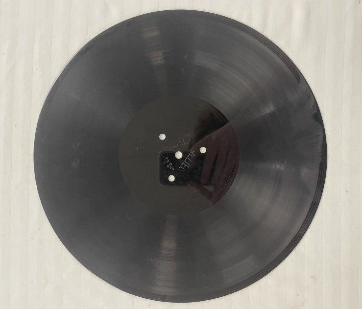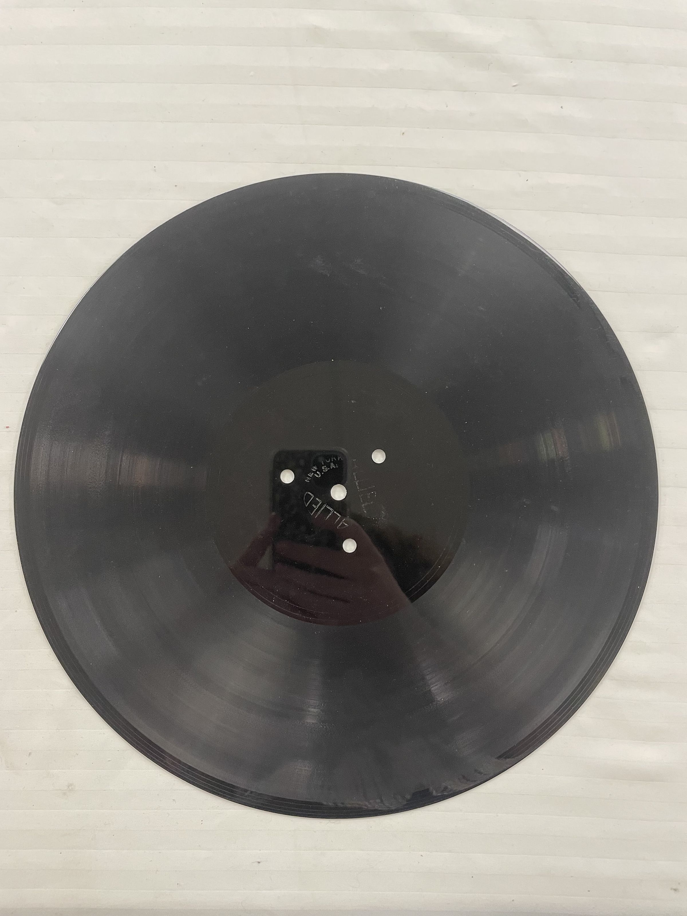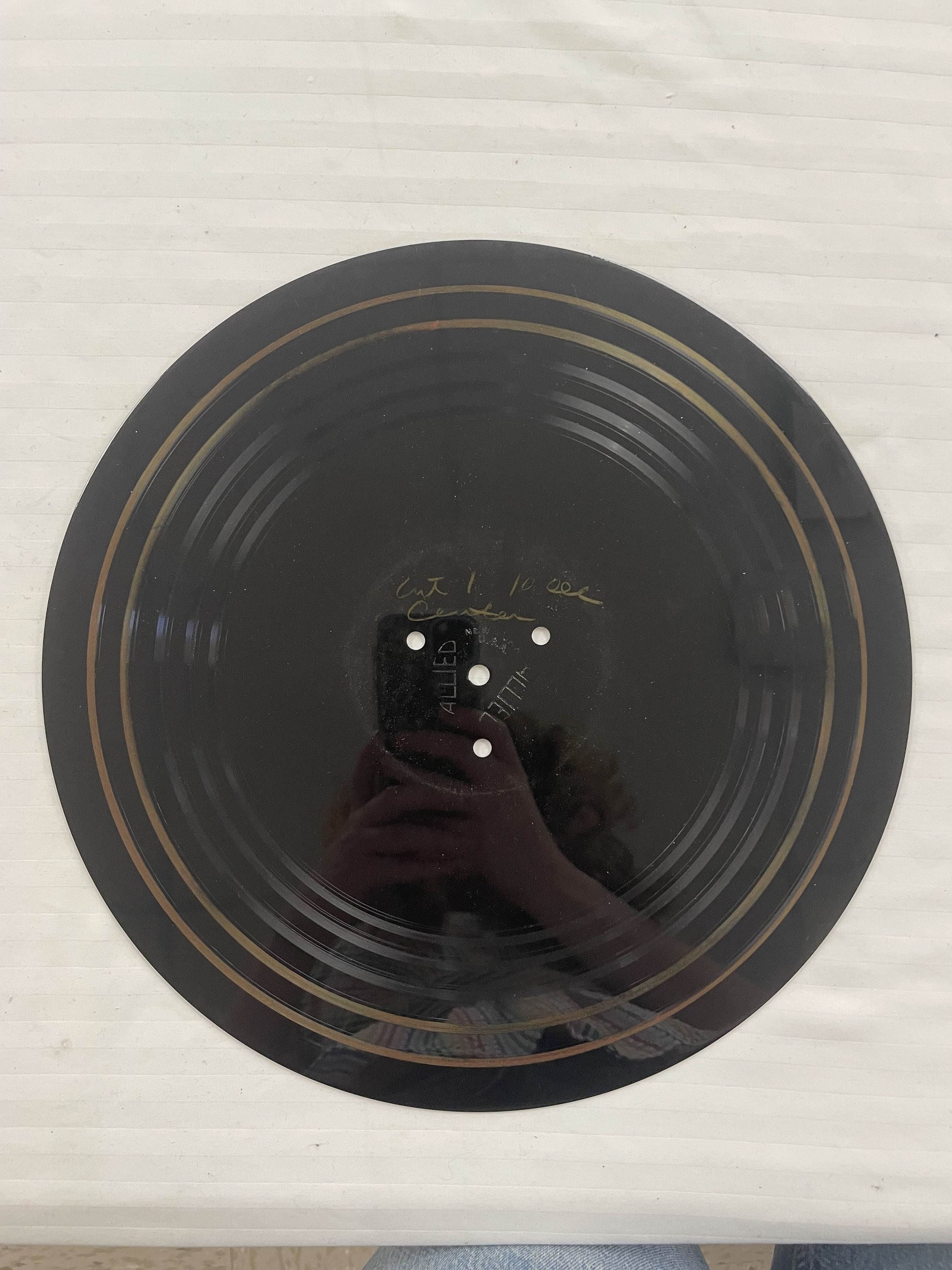 Vinyl Record likely containing Radio Ads/ Promo Piece for Broomfield Heights and the Turnpike Land Company. Seems to have recordings on both sides. No specific company is listed on either side. Handwritten in yellow is Cut 1 10 sec Center. Allied is ettched in around the spindle. Made in New York USA. One side has five very short recordings the other side is one full recording.