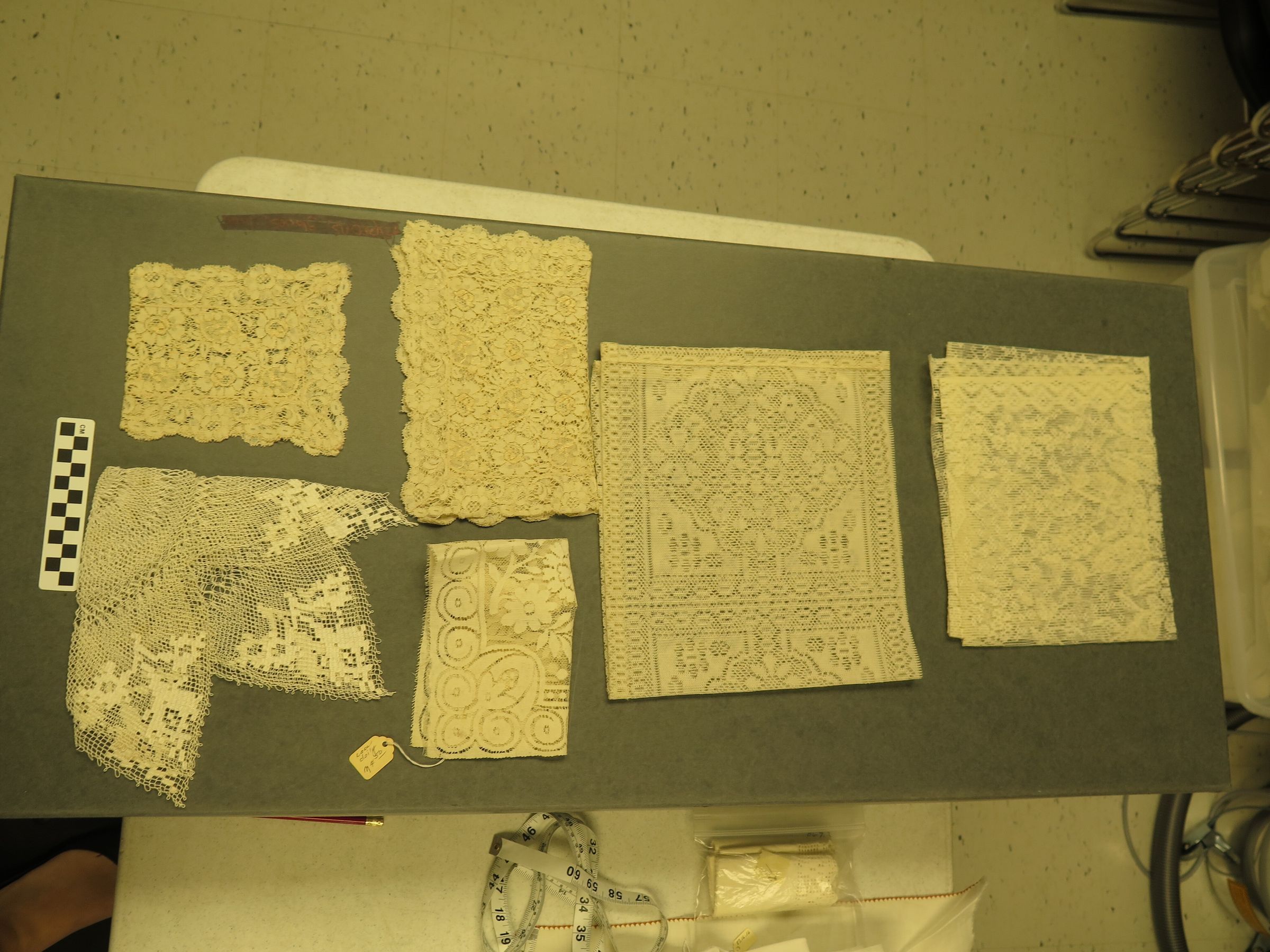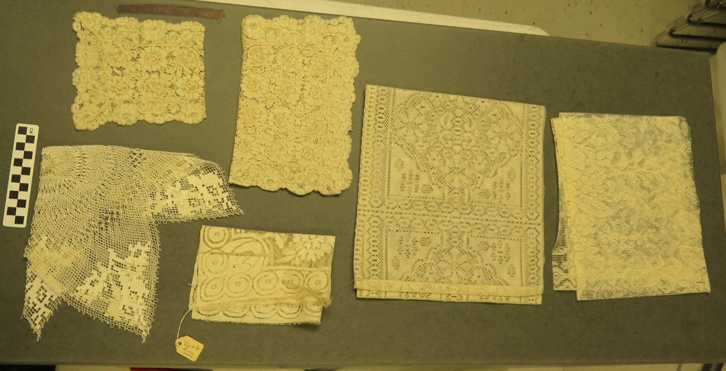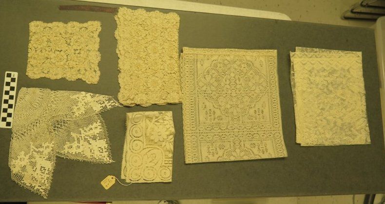 This is a set of 6 lace fragments in a plastic bag. One of the fragments has a paper tag with the text," Lace doily/ $4.50". The bag measures 10" (w) x 11" (l).