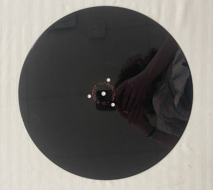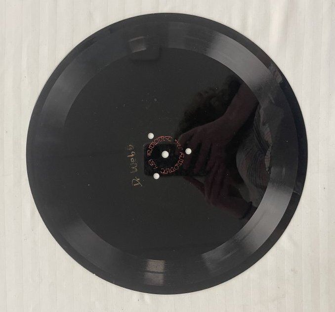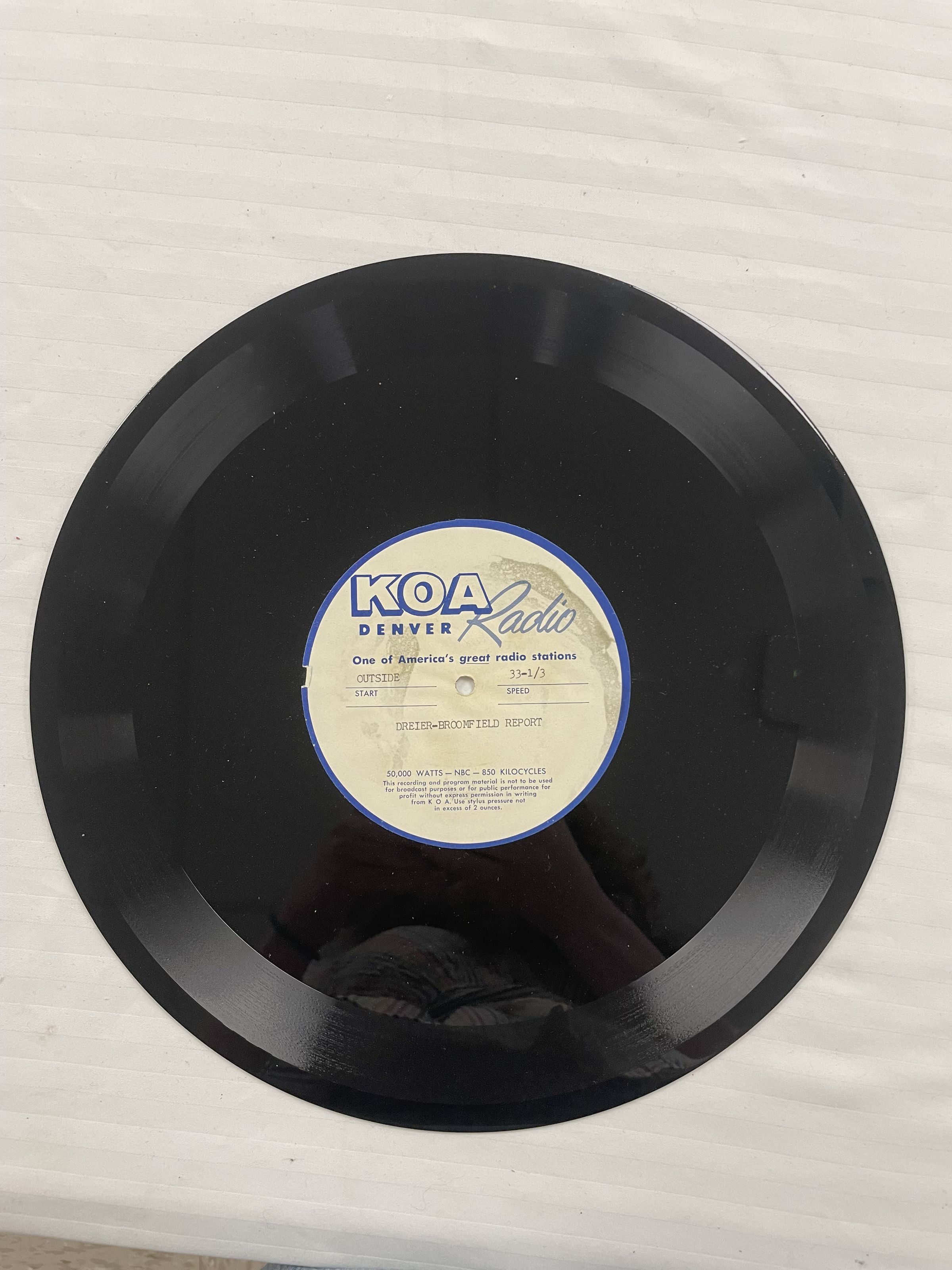 Vinyl Record likely containing Radio Advertisement/Promotion Piece for Broomfield Heights and the Turnpike Land Company. Has the circular words etched in red AudioDisc the first two numbers aren't legible the last two are 53. Made in the USA. Somebody wrote in red Dr Webb. Only the last 2.5 inches are recorded on one side.