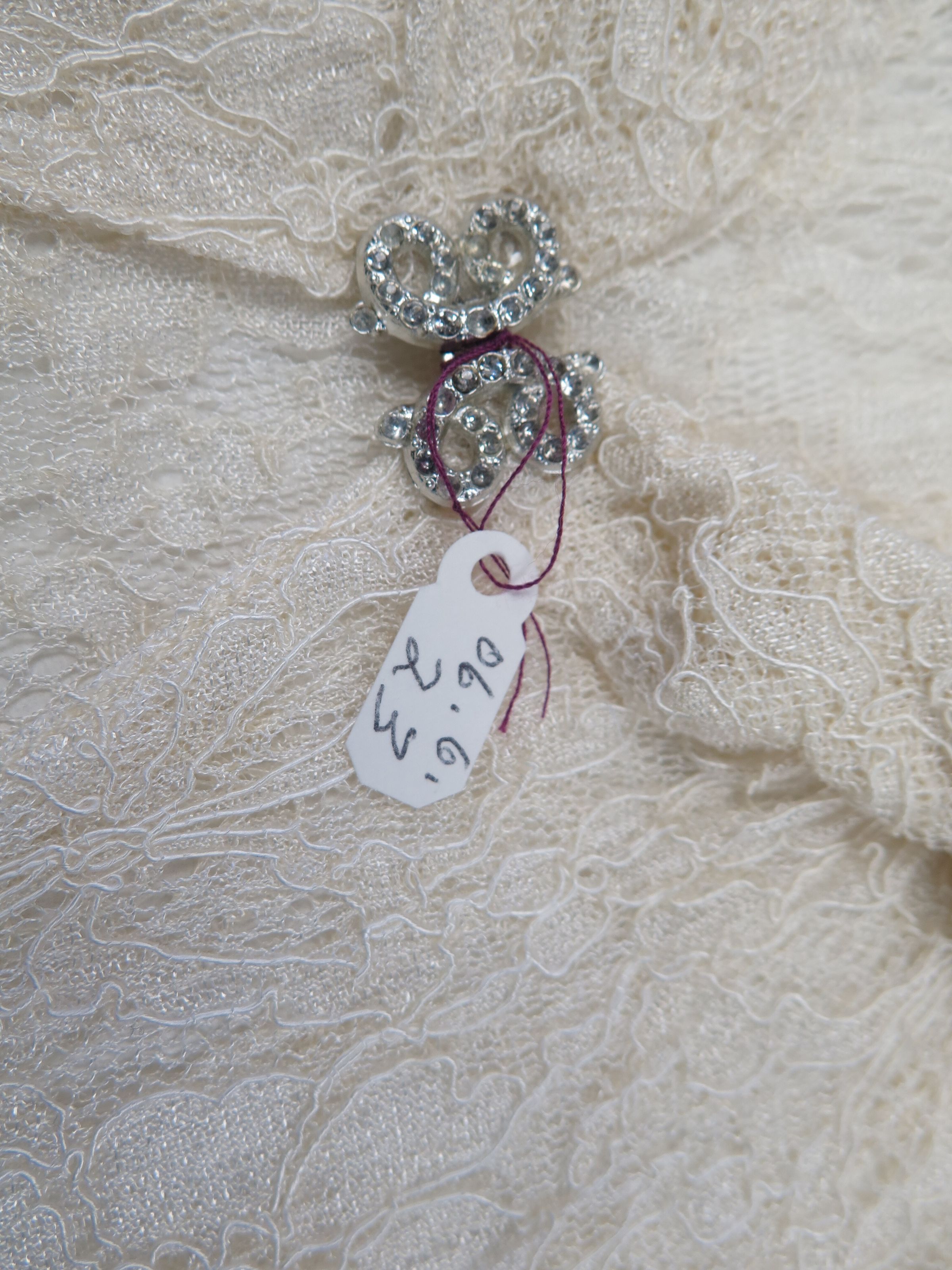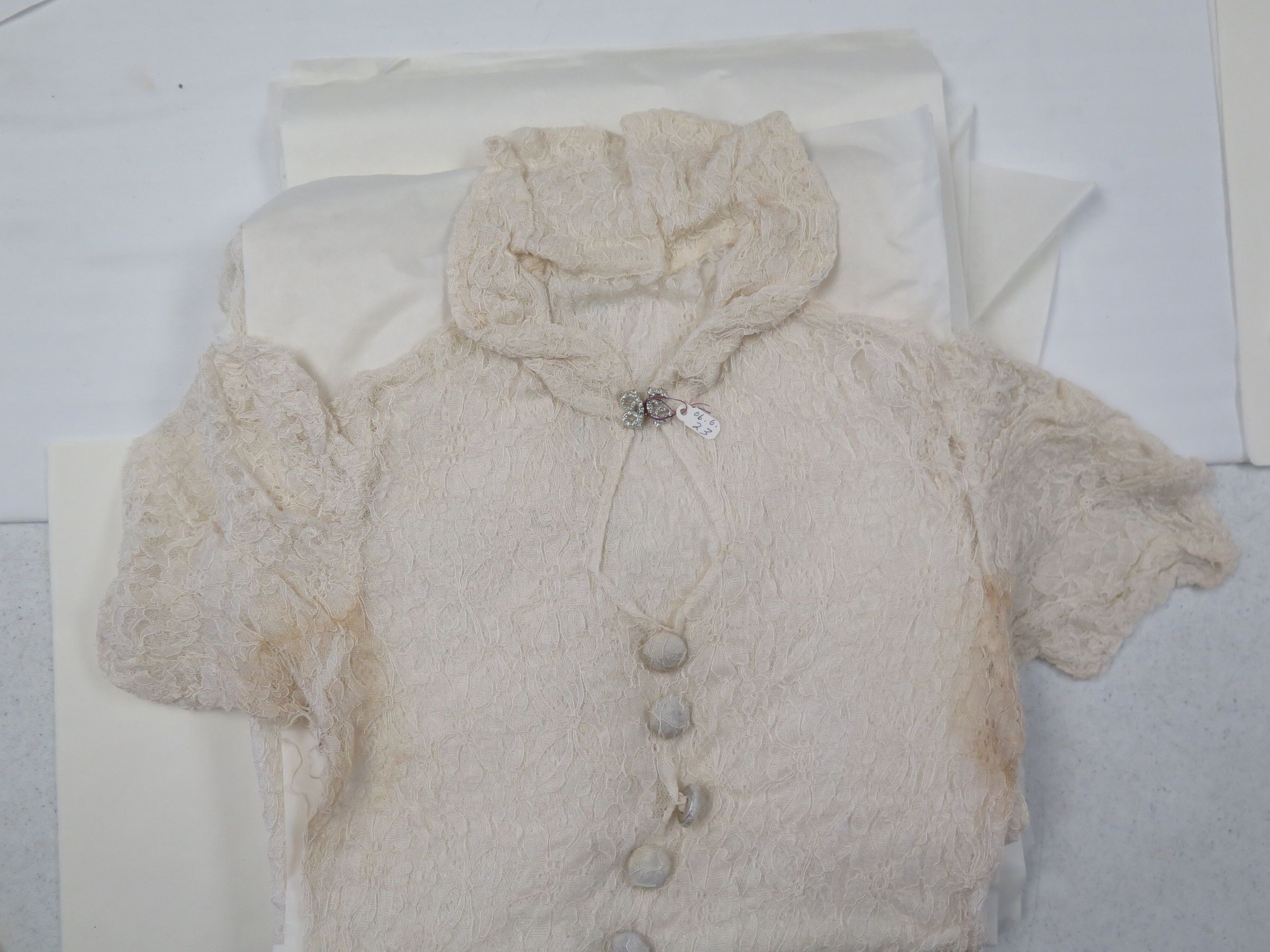 This is a floor length white flower lace dress with a silver clasp closure near the neck. The dress has cap sleeves and buttons down the front. The broach at the neck may have been added on later. The dress measures 12" (w) x 14" (l) x 2" (d) when folded.