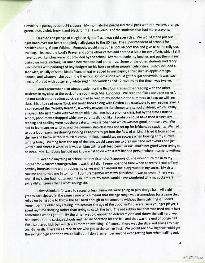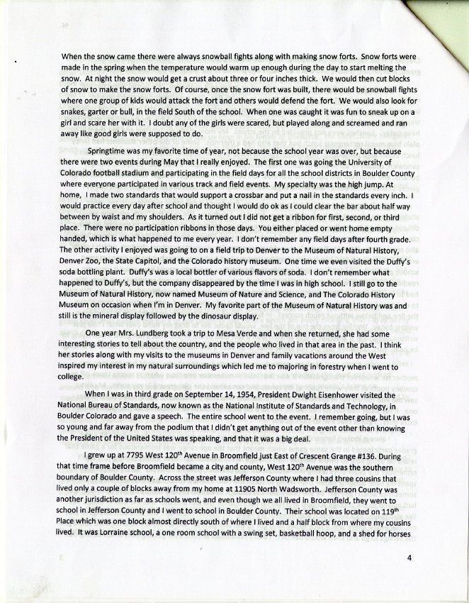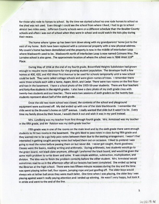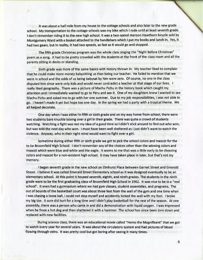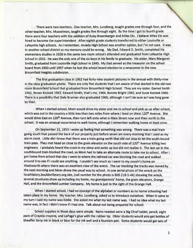 Personal account from Ed Smith about his childhood in Broomfield in the 1950s and 1960s, particularly his experience attending the old brick Broomfield School beginning in 1952 and demolished a few years later. Grew up at 7795 West 120th Avenue in Broomfield, next to the Grange (now demolished).