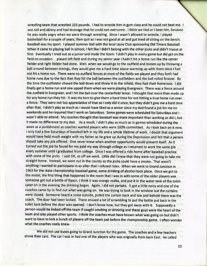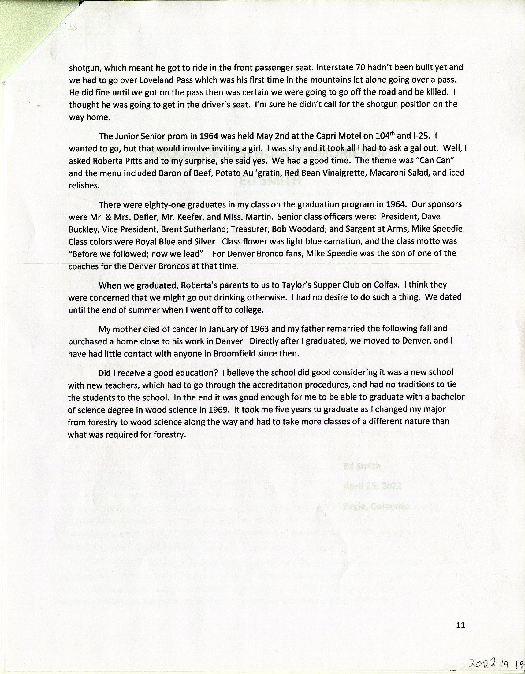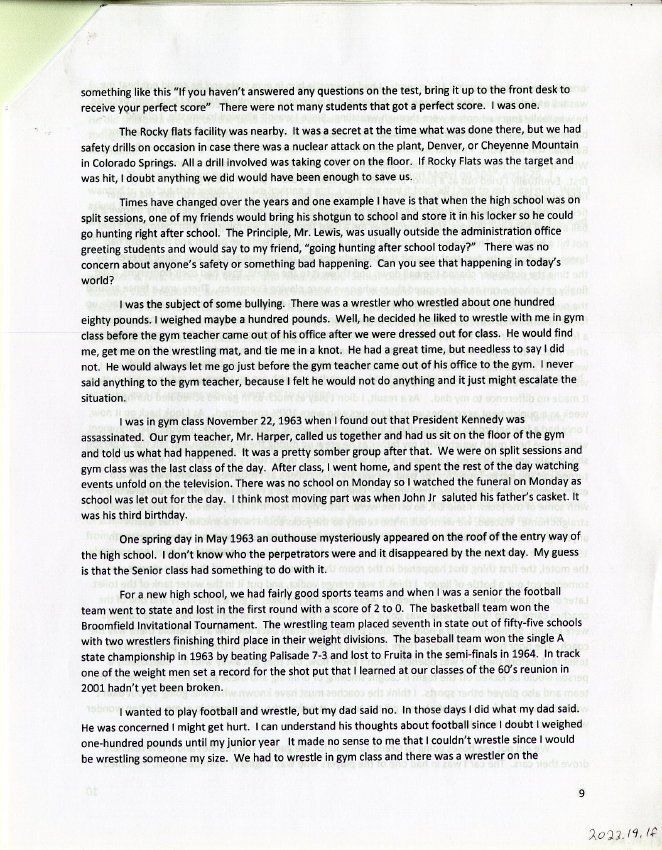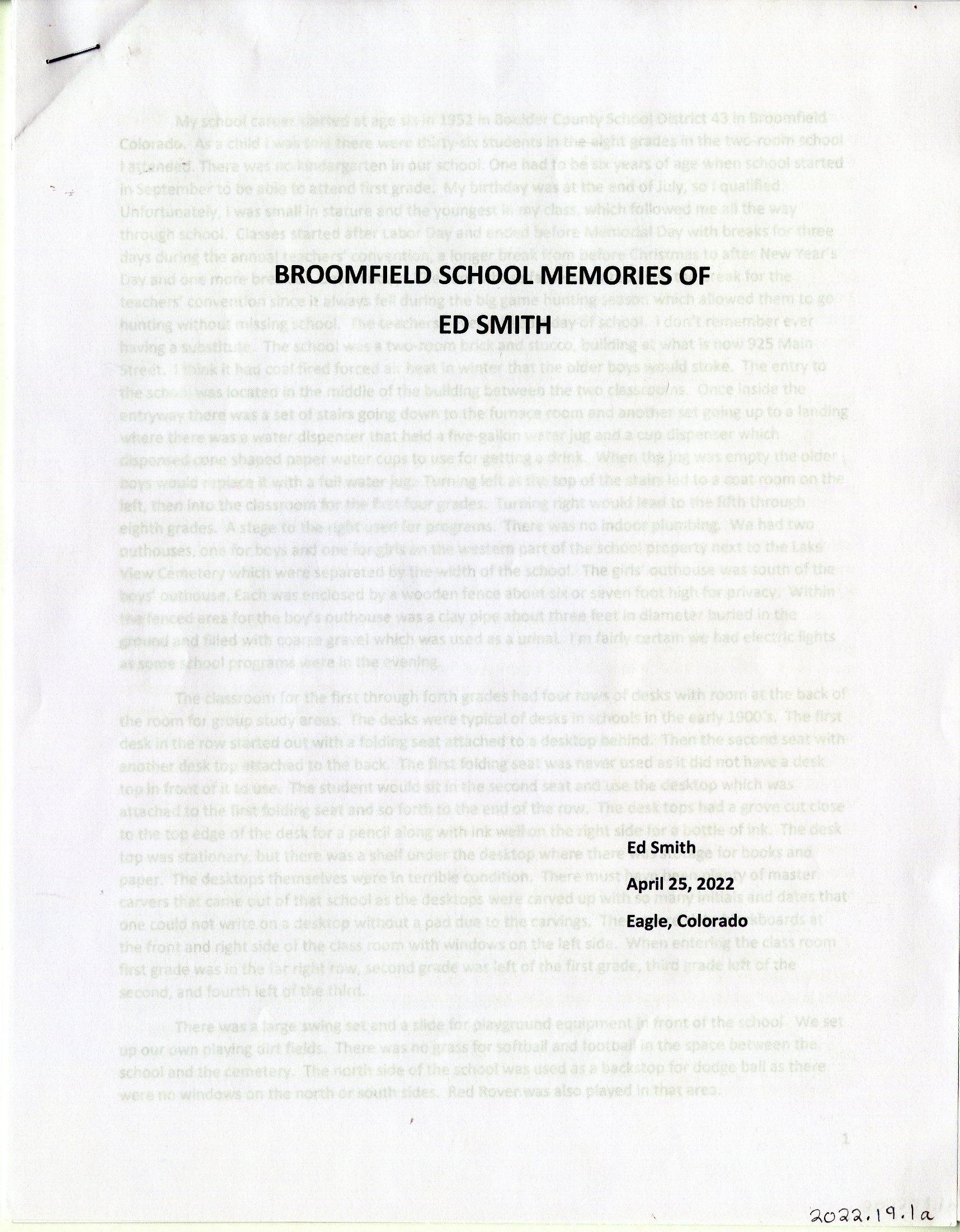 Personal account from Ed Smith about his childhood in Broomfield in the 1950s and 1960s, particularly his experience attending the old brick Broomfield School beginning in 1952 and demolished a few years later. Grew up at 7795 West 120th Avenue in Broomfield, next to the Grange (now demolished).