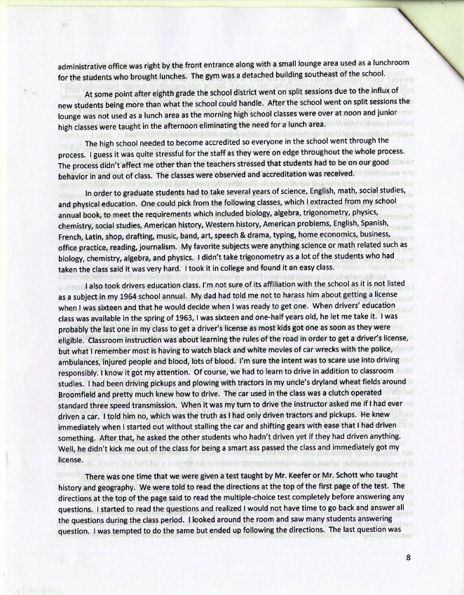 Mentions that the brick school didn't have plumbing and was heated by coal that the older boys would stoke. Says the school was located next to the cemetery. Eventually graduated from Broomfield High School in 1964. The only other students he remembers attending the old brick school that grduated high school were Garnet Smith (his sister), Renee Kozisek, Bonnie Bright, Susie Kozisek, and maybe Dale Brunner.