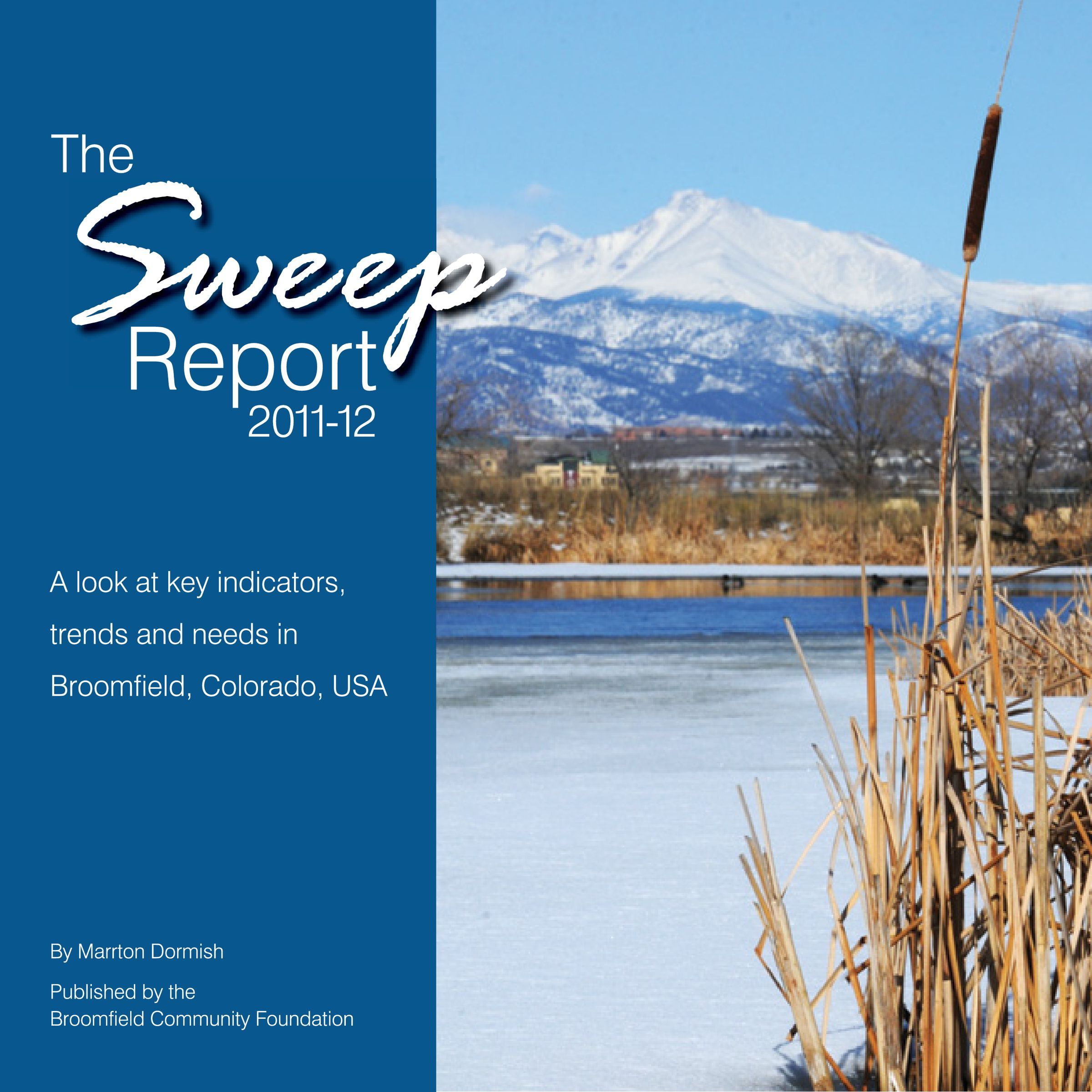 Sweep Report 1.0 - 2012 Edition. Written by Marrton Dormish with Karen Smith. Published by the Broomfield Community Foundation. "A look at key indicators, trends and needs in Broomfield, Colorado, USA in 2011-12." Includes information on Broomfield's "past, present, and future." Includes demographic info, statistics, property values, rent prices, incomes, homelessness, housing affordability, employers, education attainment, schools, energy, environmental concerns.