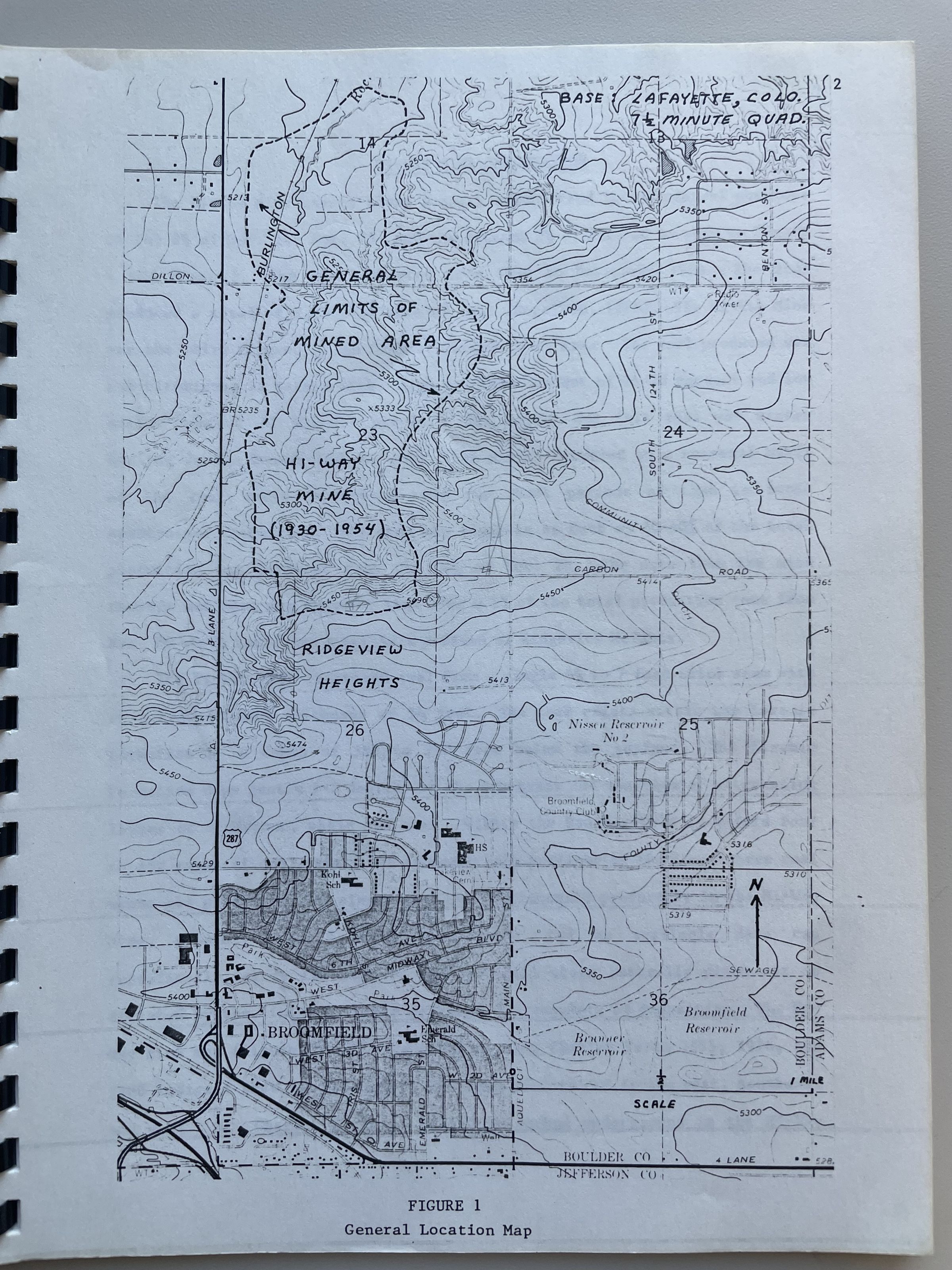 Geological report ("Subsistence Potential at Ridgeview Heights"on the potential for a housing development called "Ridgeview Heights" near the "Hi Way Mine" (the area that is now Ruth Roberts Park in northeast Broomfield/southeast Lafayette). This housing development looks to be today's neighborhood around Ridgeview Circle near Kohl Street and the water tanks.