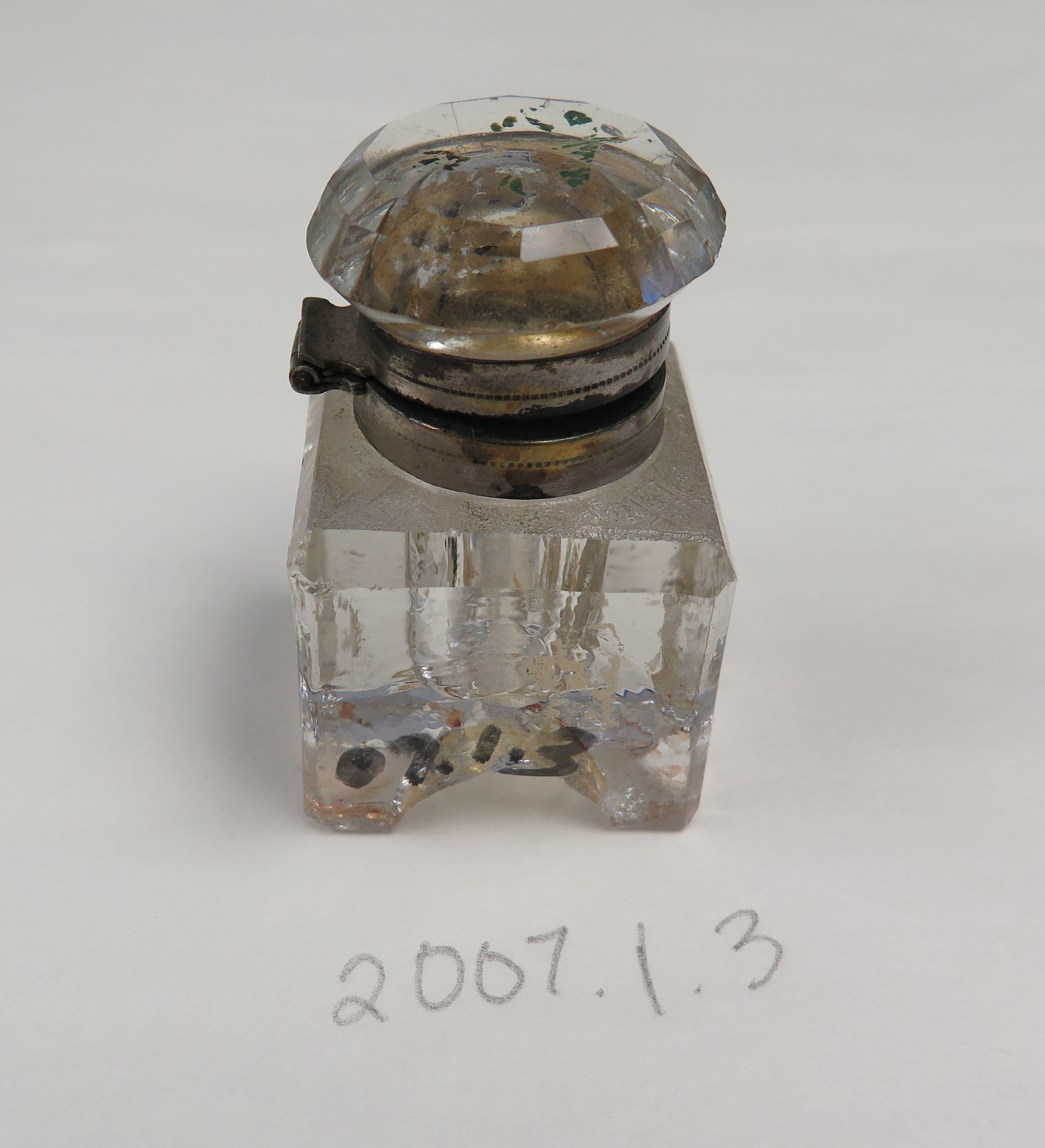 This is a clear glass ink bottle with a flip top glass lid. The base of the ink bottle is square, and the top is round. The ink bottle measures 2.5" (h) x 1.5" (w) x 1.5" (l).