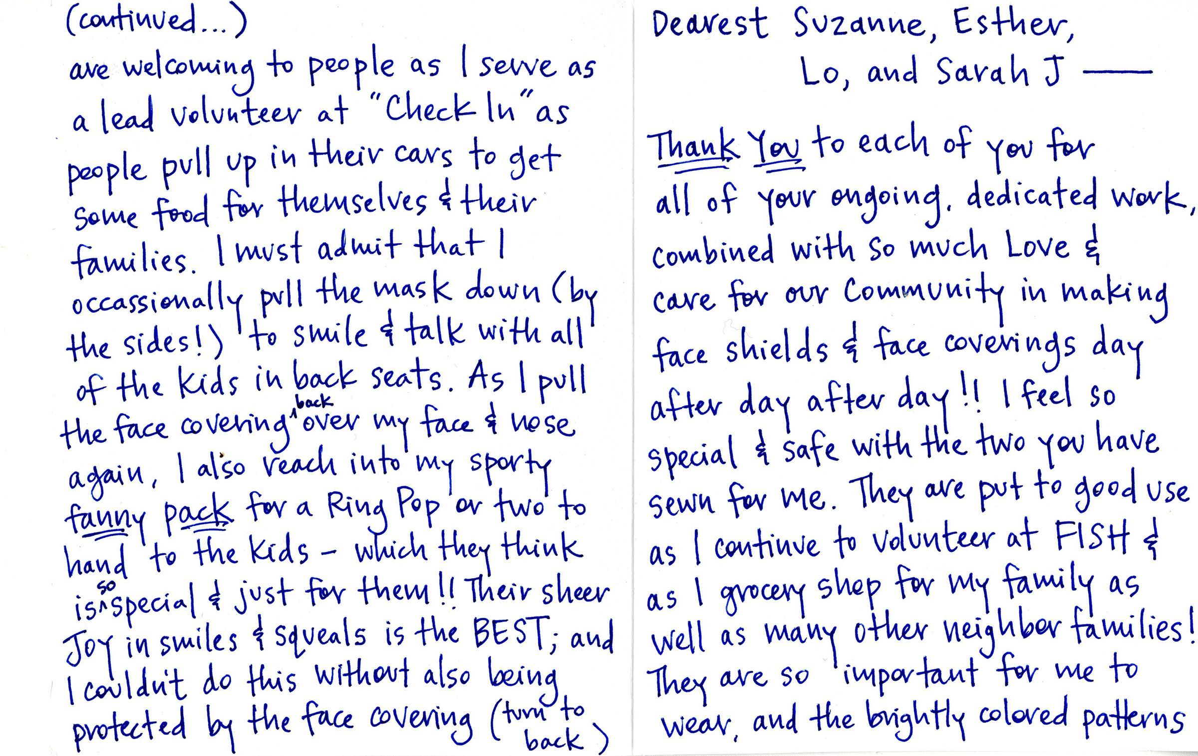 (continued...) are welcoming to people as I serve as a lead volunteer at "Check In" as people pull up in their cars to get some food for themselves & their families. I must admit that I occassionally pull the mask down (by the sides!) to smile & talk with all of the kids in back seats. As I pull the face covering back over my face & nose again, I also reach into my sporty fanny pack for a Ring Pop or wo to hand to the kids - which they think is so special & just for them!! Their sheer JOY in smiles & squeals is the BEST; and I couldn't do this without also being protected by the face covering (turn to back)