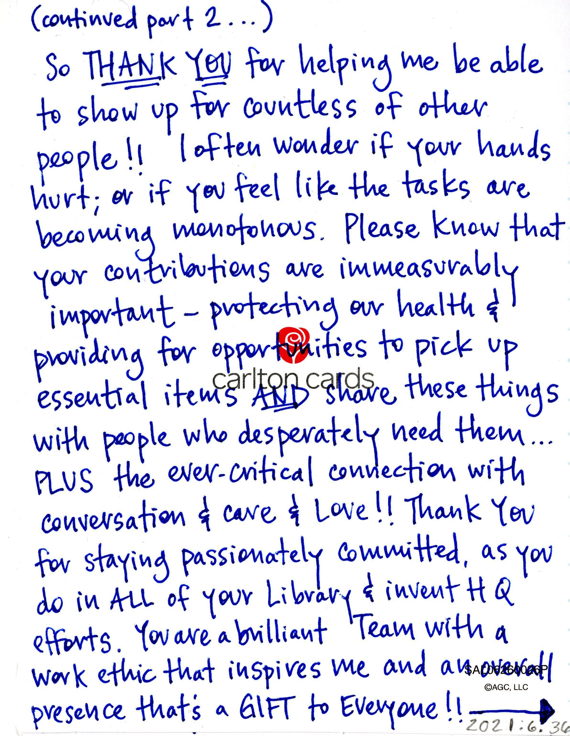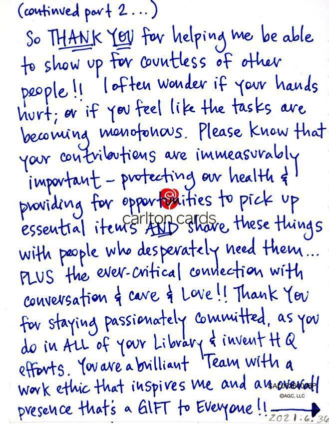 So THANK YOU for helping me be able to show up for countless of others people!! I often wonder if your hands hurt; or if you feel like the tasks are becoming monotonous. Please know that your contributions are immeasurably important - protecting our health & providing for opputunities to pick up essential items AND share these things with people who desperately need them... PLUS the ever-critical connection with conversation & care & Love!! Thank you for staying passionately committed, as you do in ALL of your Library & invent HQ efforts. You are a brilliant Team with a work ethic that inspires me and an overall presence that's a GIFT to Everyone!!"Collection