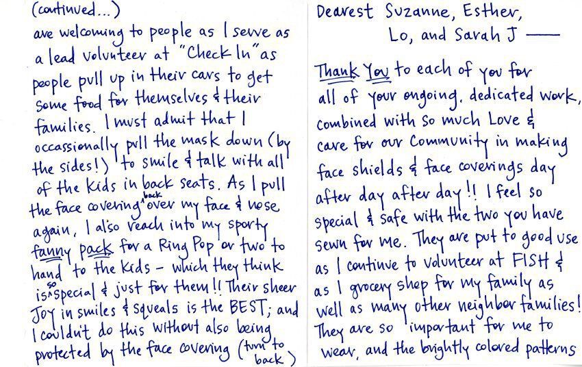 Thank you to each of you for all of your ongoing, dedicated work combined with so much Love & care for our community in making face shields & face coverings day after day after day!! I feel so special & safe with the two you have sewn for me. They are put to good use as I continue to volunteer at FISH & as I grocery shop for my family as well as many other neighborhood families! They are so important for me to wear, and the brghtly colored patterns