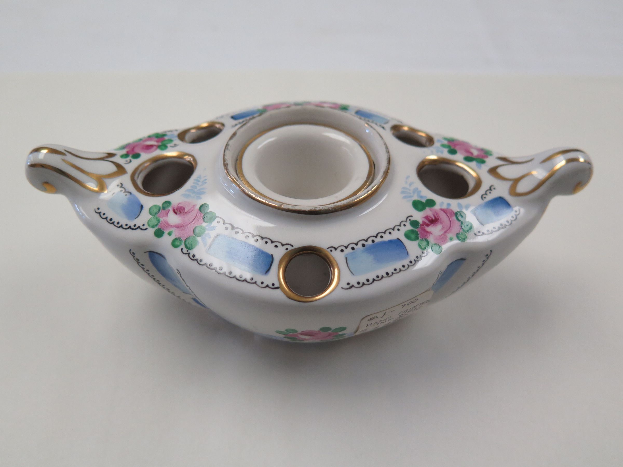 This is a china ink well with 6 holes around the main hole in the center. The inkwell is an oblong shape with handles on either side. The inkwell has a floral pattern painted on it in pink, green, and blue. The inkwell measures 2.5" (h) x 6.5" (w) x 4" (l).