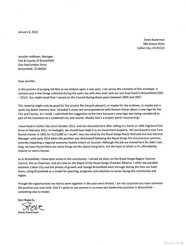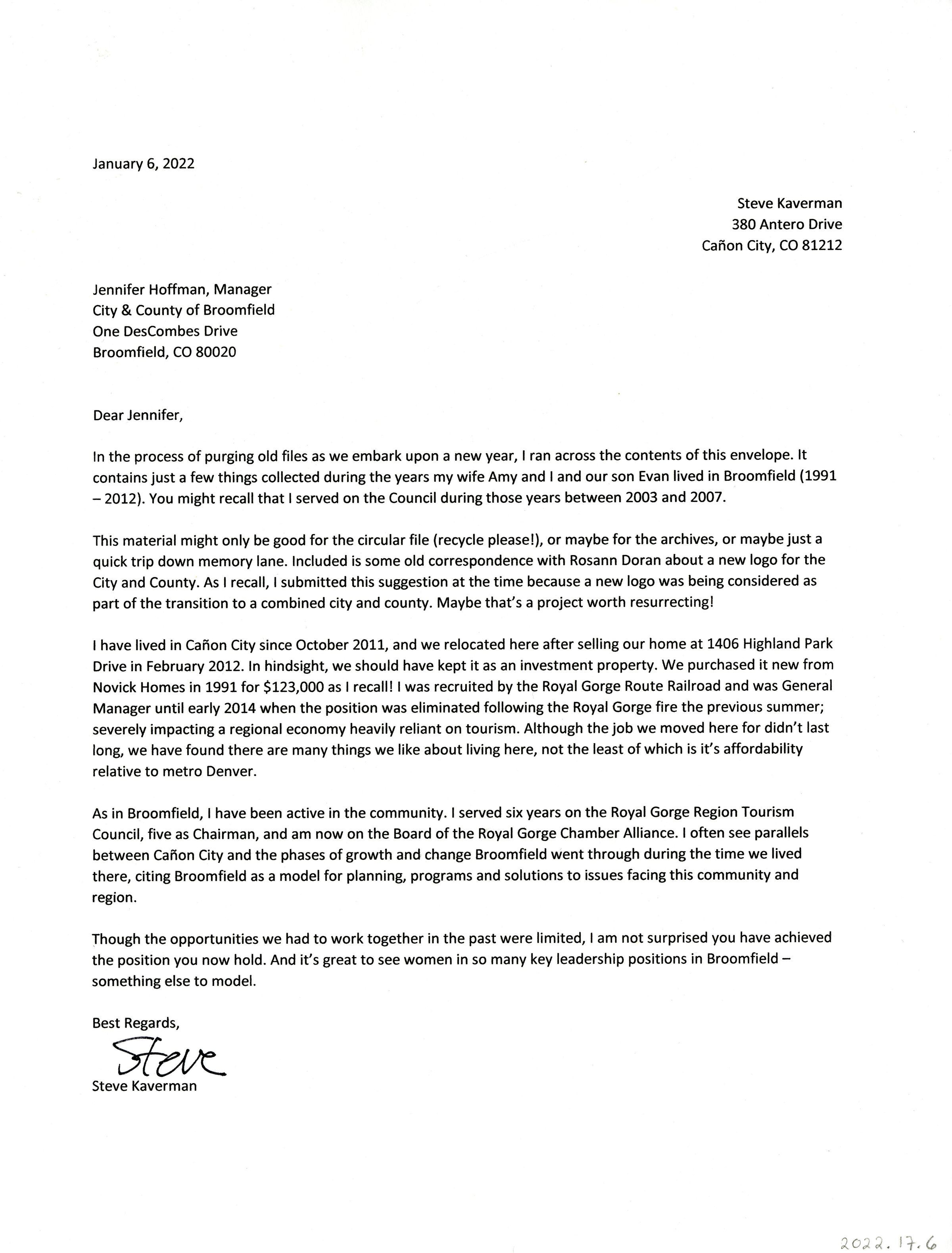 A letter to Jennifer Hoffman From Steve Kaverman about living in Broomfield with his family as well as his complishments in the Broomfield Community.