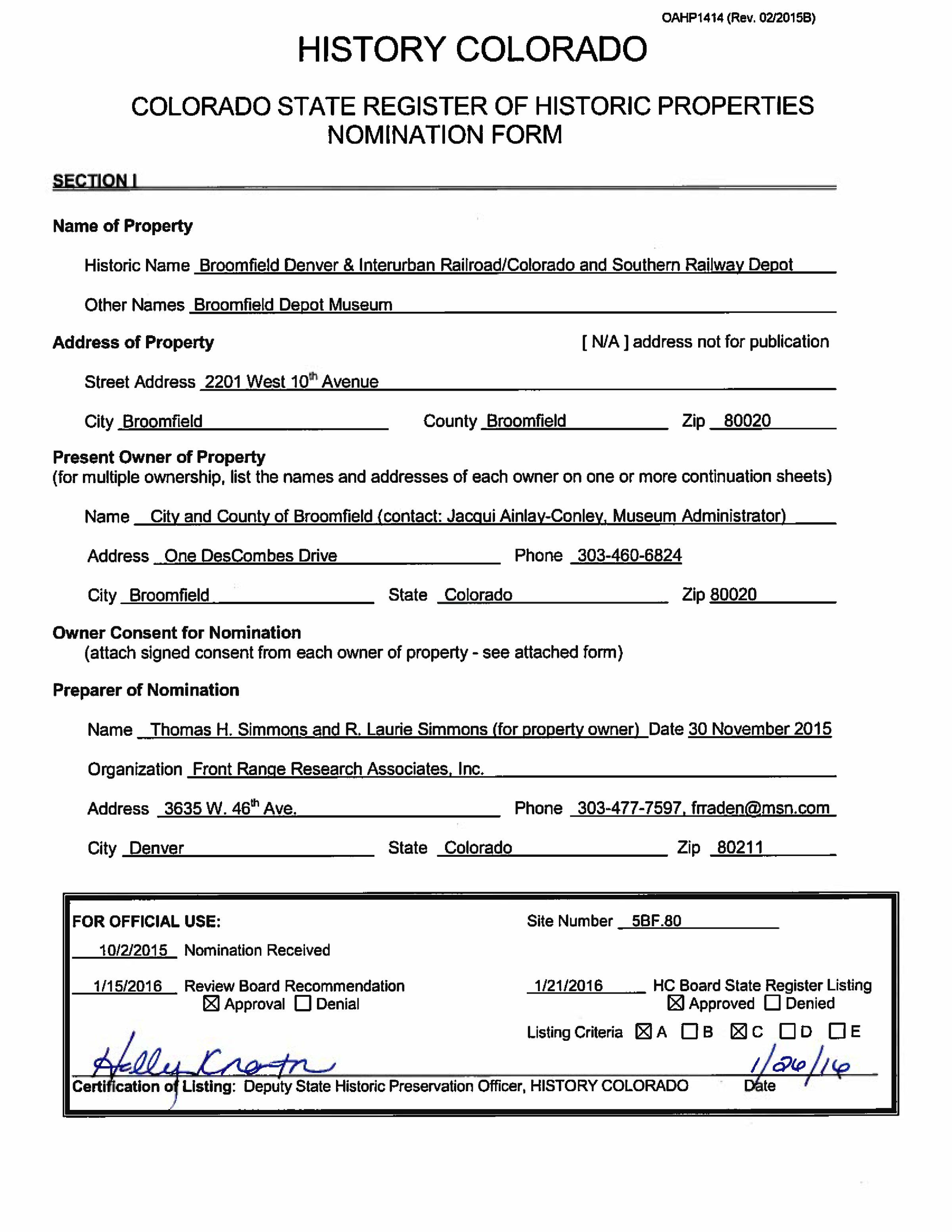 Digital File. Colorado State Register of Historic Properties Nomination Form for Depot Museum Building. Includes a history and architectural description of the building, including a detailed history of who lived there and a bibliography for future reading.Lexicon