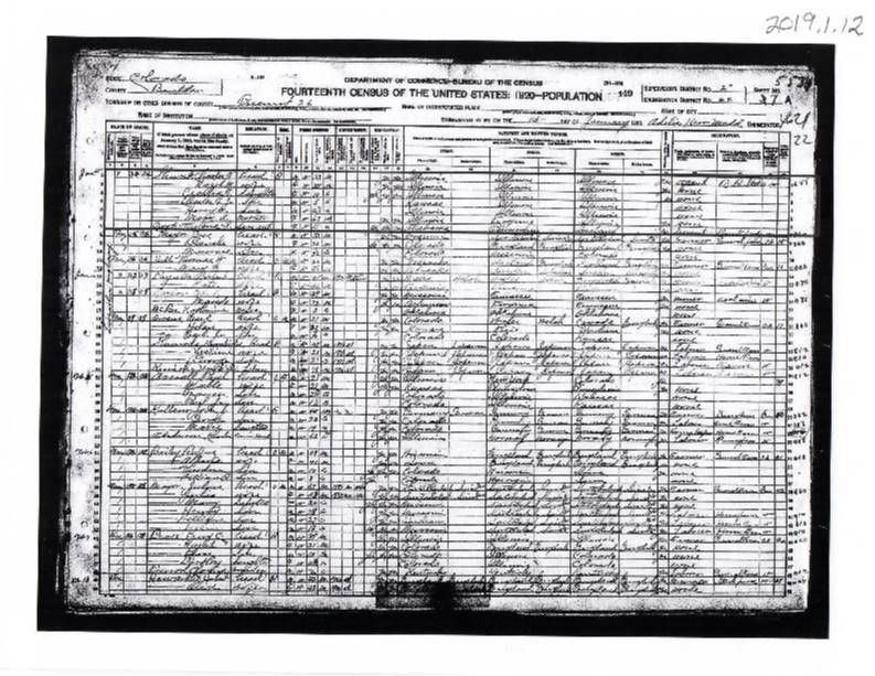 Copy of 1920 Census showing Charles F. Shunk as Station Agent at Burns Junction with wife, mother, and four children.Collection