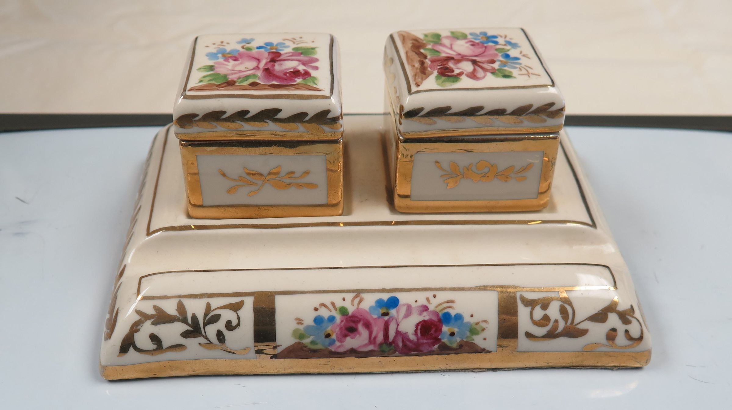 The china inkwell set consists of two wells and two lids as well as a stand. It measures 3" (h) x 4.75" (w) x 6.5" (l). The bottom of one inkwell is marked ".2", while the other is marked ".23".