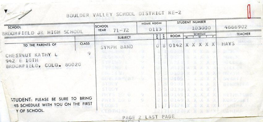 Class Schedule - Kathy Chestnut 1971-72 Broomfield Junior HighCollection