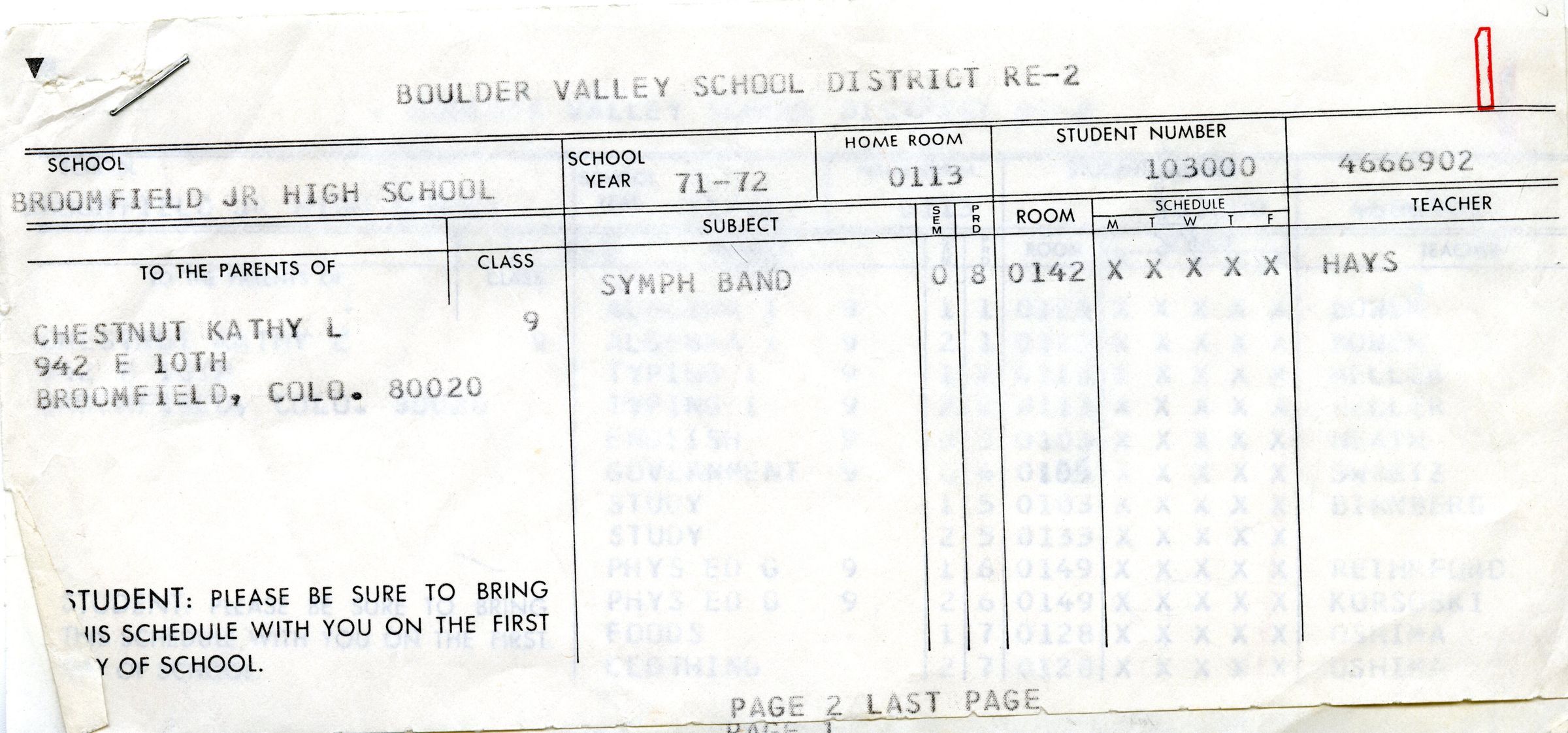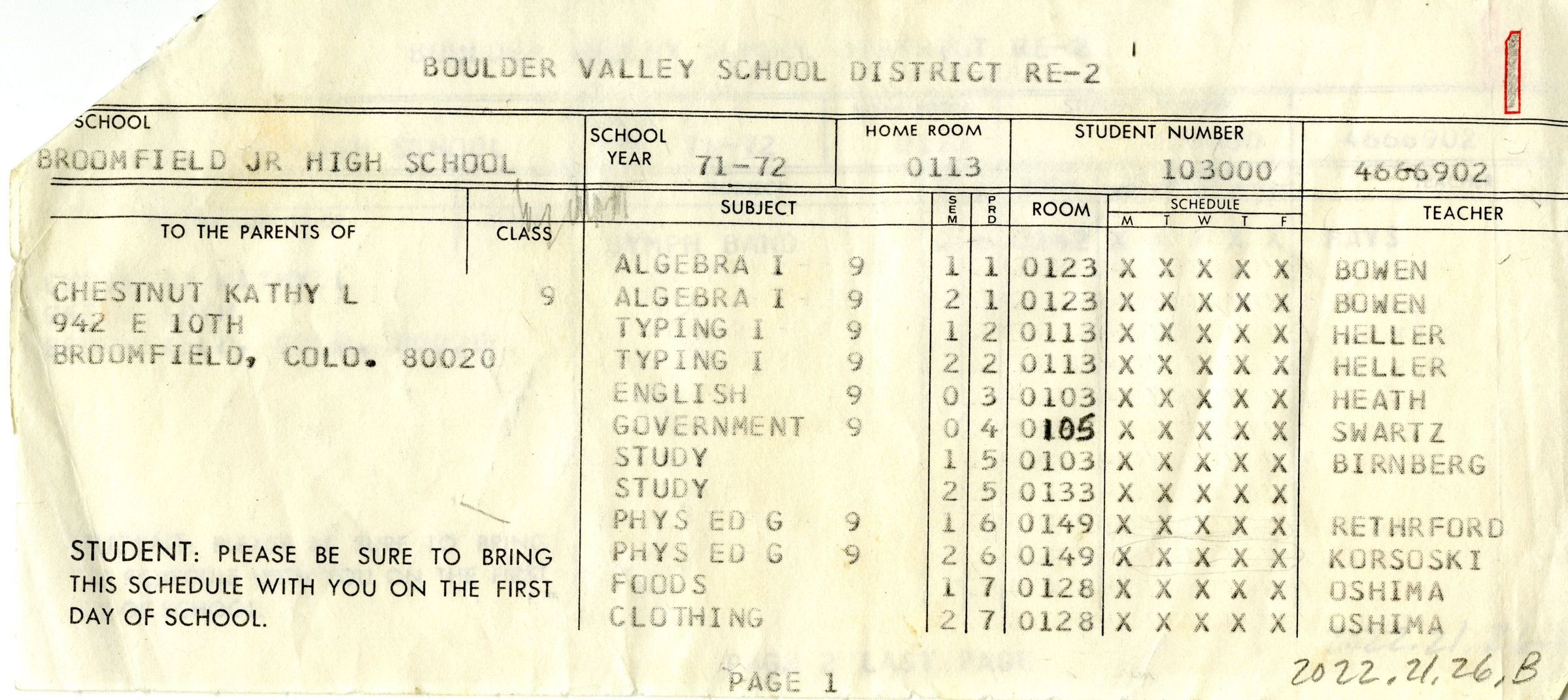 Class Schedule - Kathy Chestnut 1971-72 Broomfield Junior HighEntry/Object ID