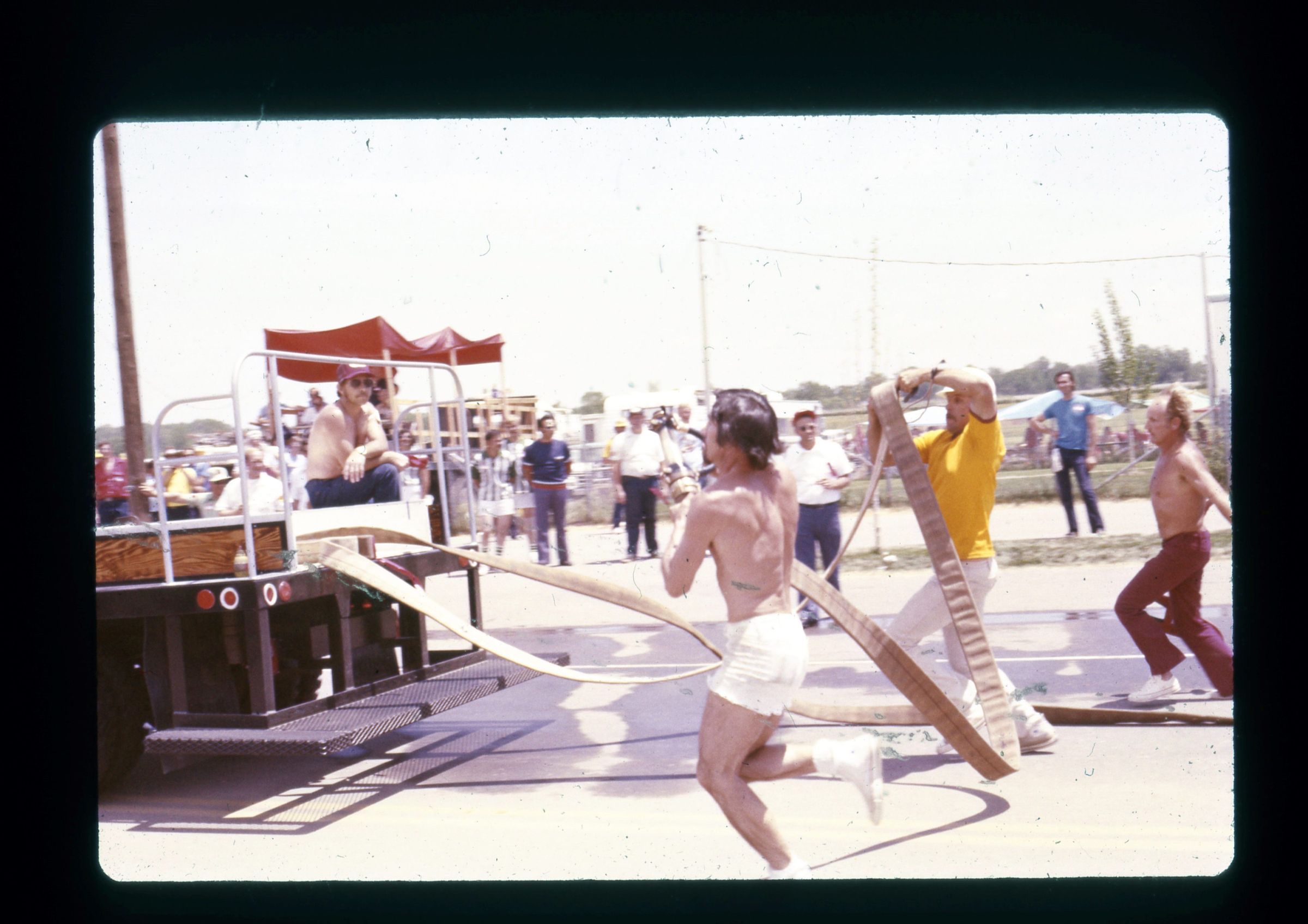 A color transparency depicting the West Adams County Fire Protection District Running Team at the 1976 Tri-County Field Day. A man is riding in the back of a pick-up truck while a group of other men run behind it. Onlookers watch from the sidelines.