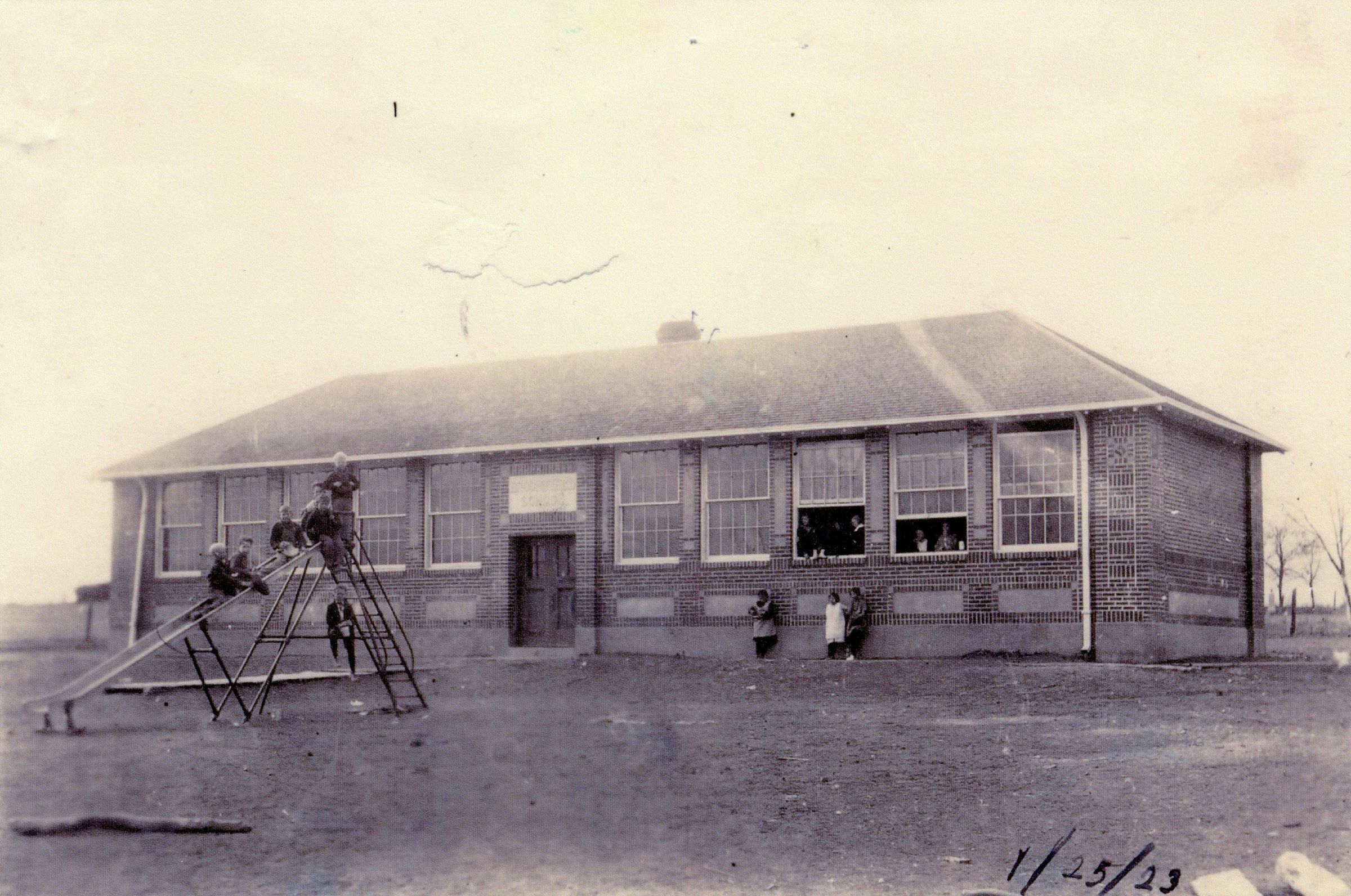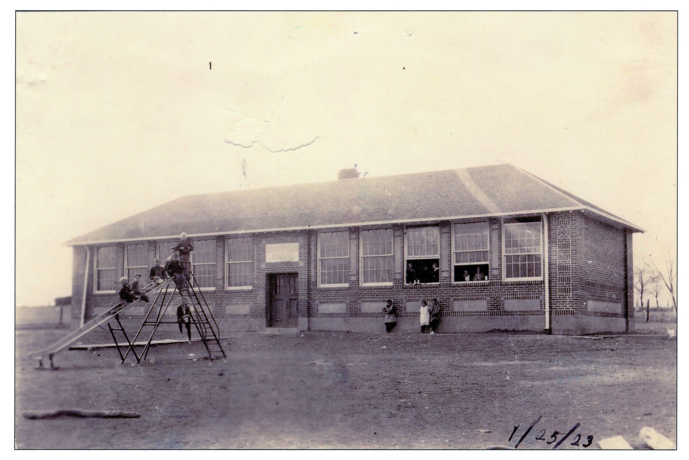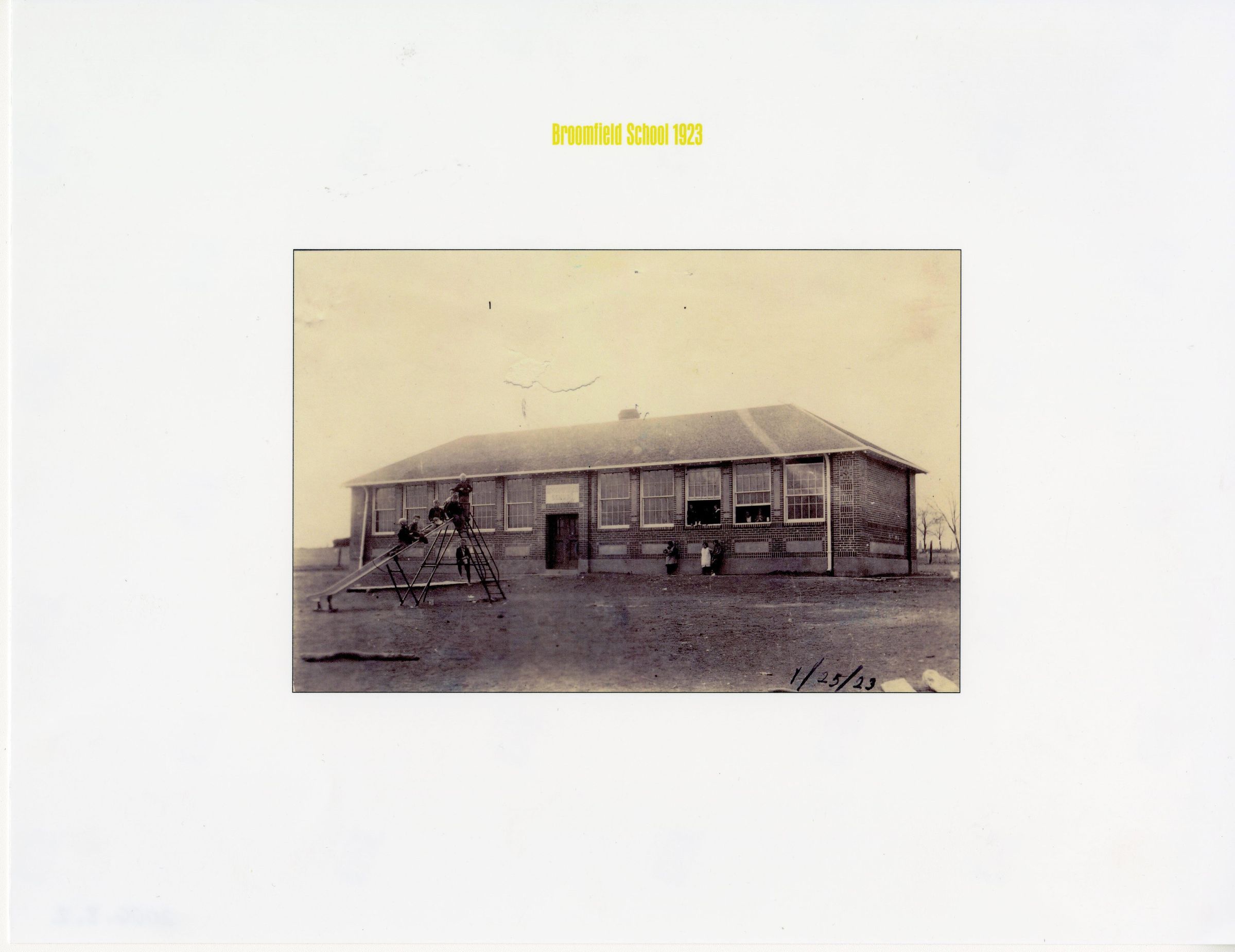 A picture of the Broomfield School in 1923. The photo depicts a brick building with 10 windows. There is a slide in the foreground with 7 school kids playing on it. There are three students sitting in one window, with two other students looking out another. Three students are standing beneath the windows. In the background there are trees and fields. The photo is reprinted on new paper, but the original piece of paper shows wear, and looks to have a rip on it.