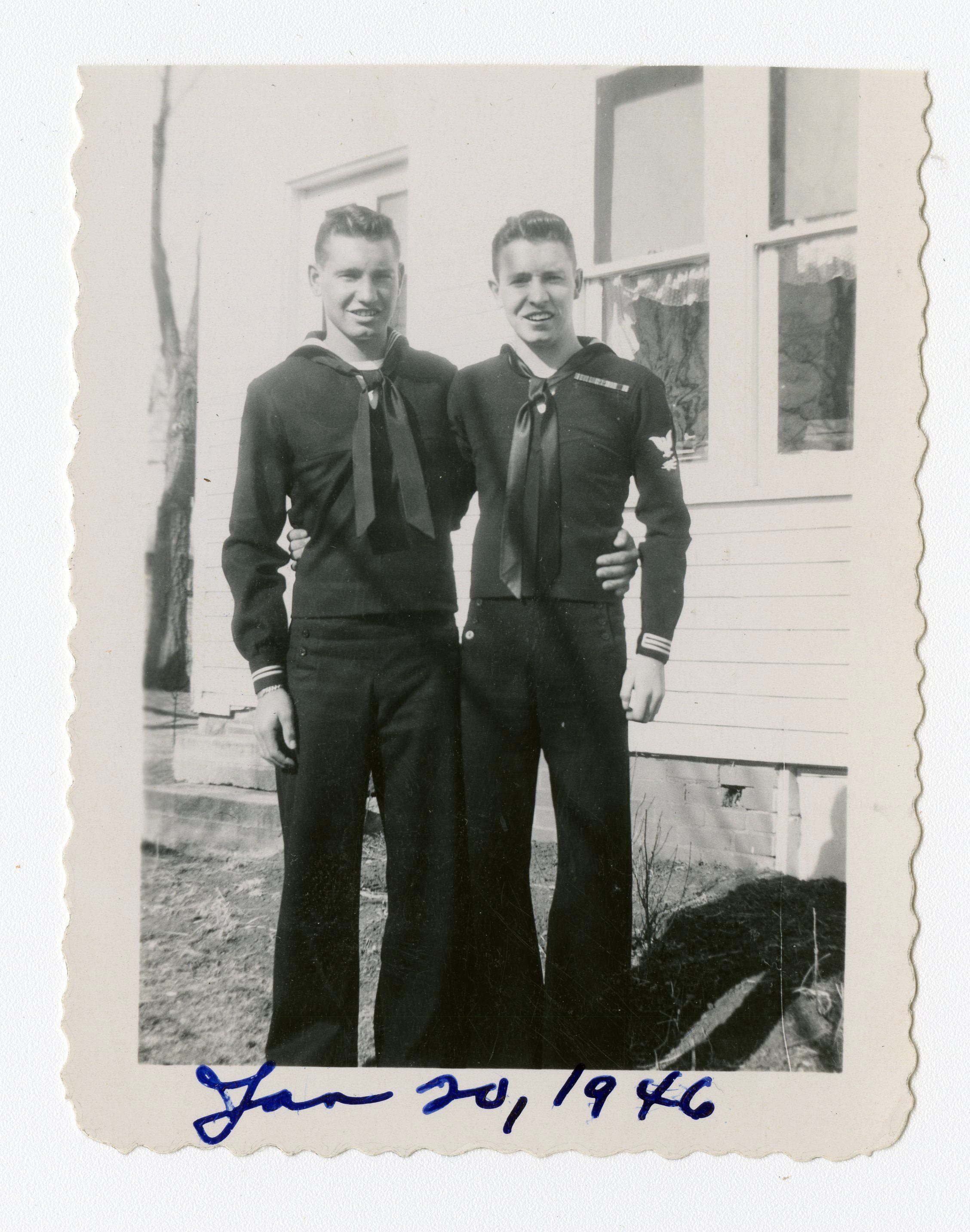 Black and white photograph of two of the Brunners. They are probably Gib and Clyde. Both men are wearing navy uniforms.