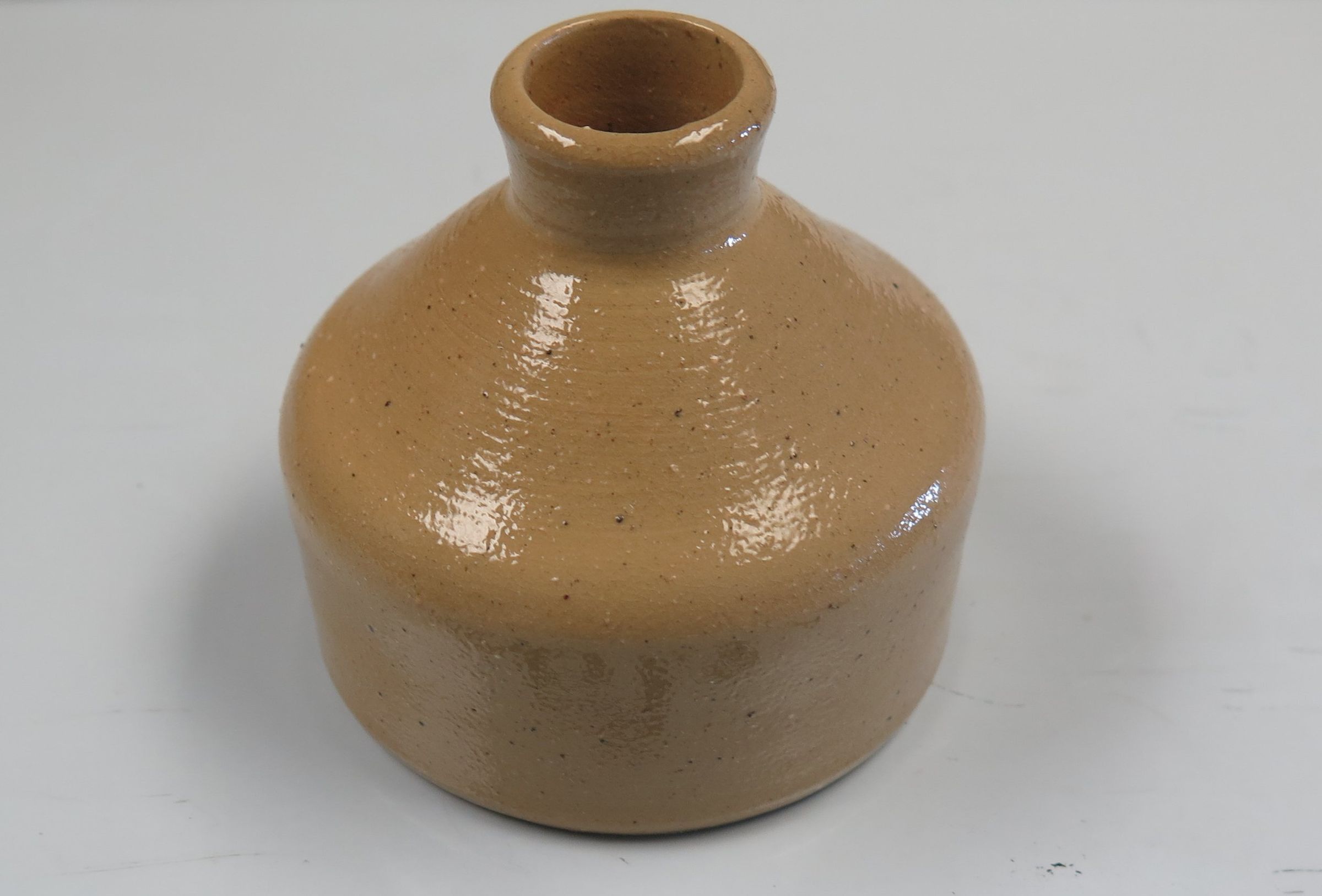 This brown pottery inkwell measures 2.25" (h) x 2.25" (d) and does not have a stopper.