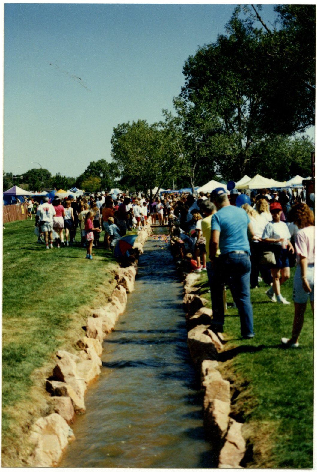 Item is a colored photograph taken during the 1990 Broomfield Days celebration. The photo features a river lined with rocks in the center, and huge crowds are lining its edges to witness the rubber duck race hosted by Broomfield High School. The rubber ducks are just barely visible in a group at the starting line. Grassy fields surround the river on both sides, and blue and white tents hosting other festivities can be seen in the background amidst large trees. The clear blue sky completes the view.Photograph Details