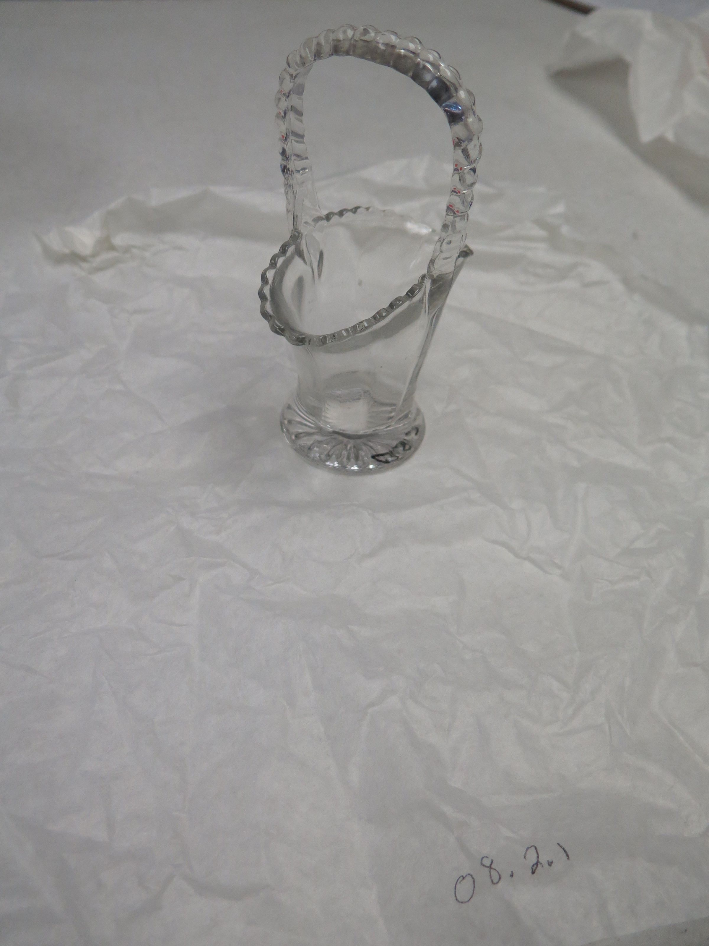 This is a miniature decorative clear glass basket with a handle on the top. The vase measures 5.75" (h) x 3.5" (w) x 2" (l).