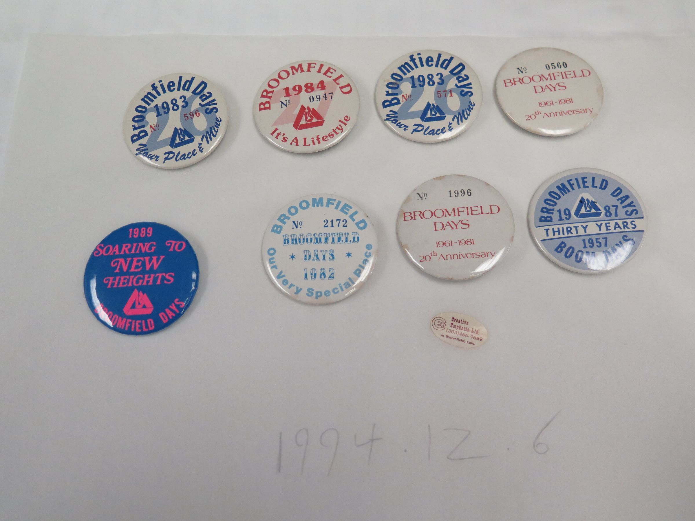 This is a set of 8 Broomfield Days buttons. There are 2 buttons from 1981 (No. 0560 and 1996), 1 from 1982 (No. 2172), 2 from 1983 (No. 571 and 596), 1 from 1984 (No. 0947), 1 from 1987, and 1 from 1989. Each button measures 2.25" (dia).Collection
