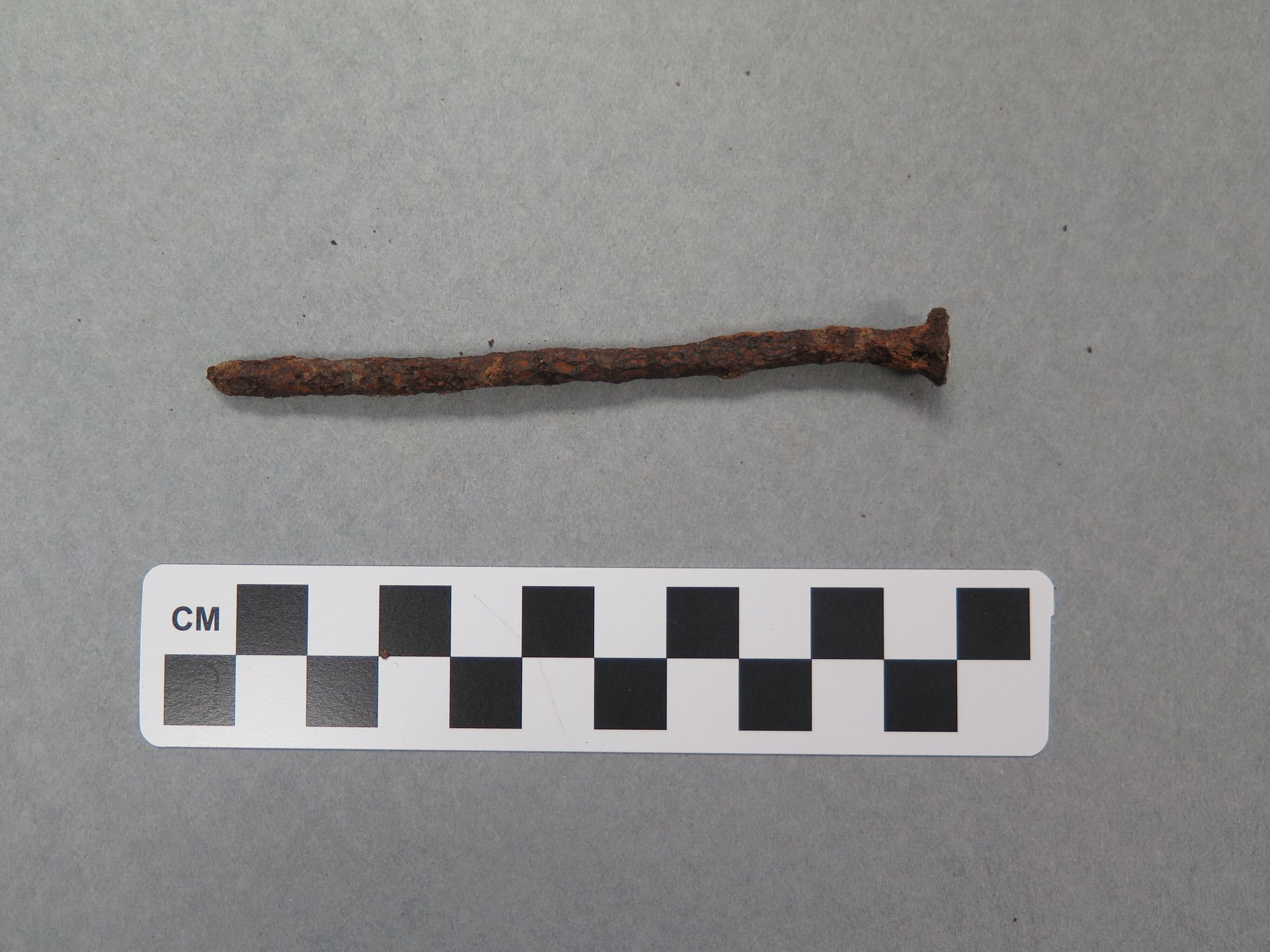 This is a metal nail that is very rusted. The head of the nail is circular as well as the body of the nail. The nail measures 4" (l) x .5" (diam).