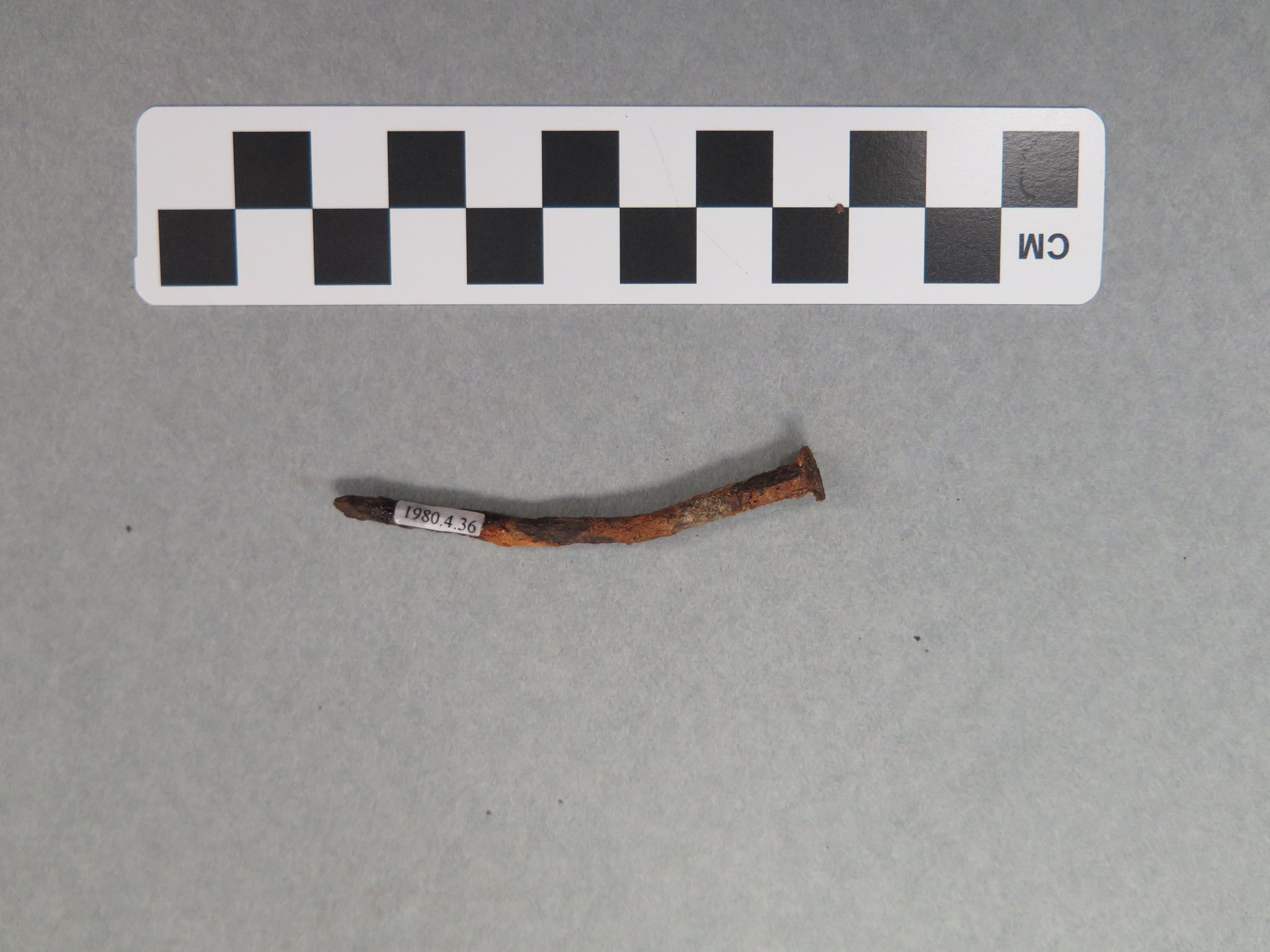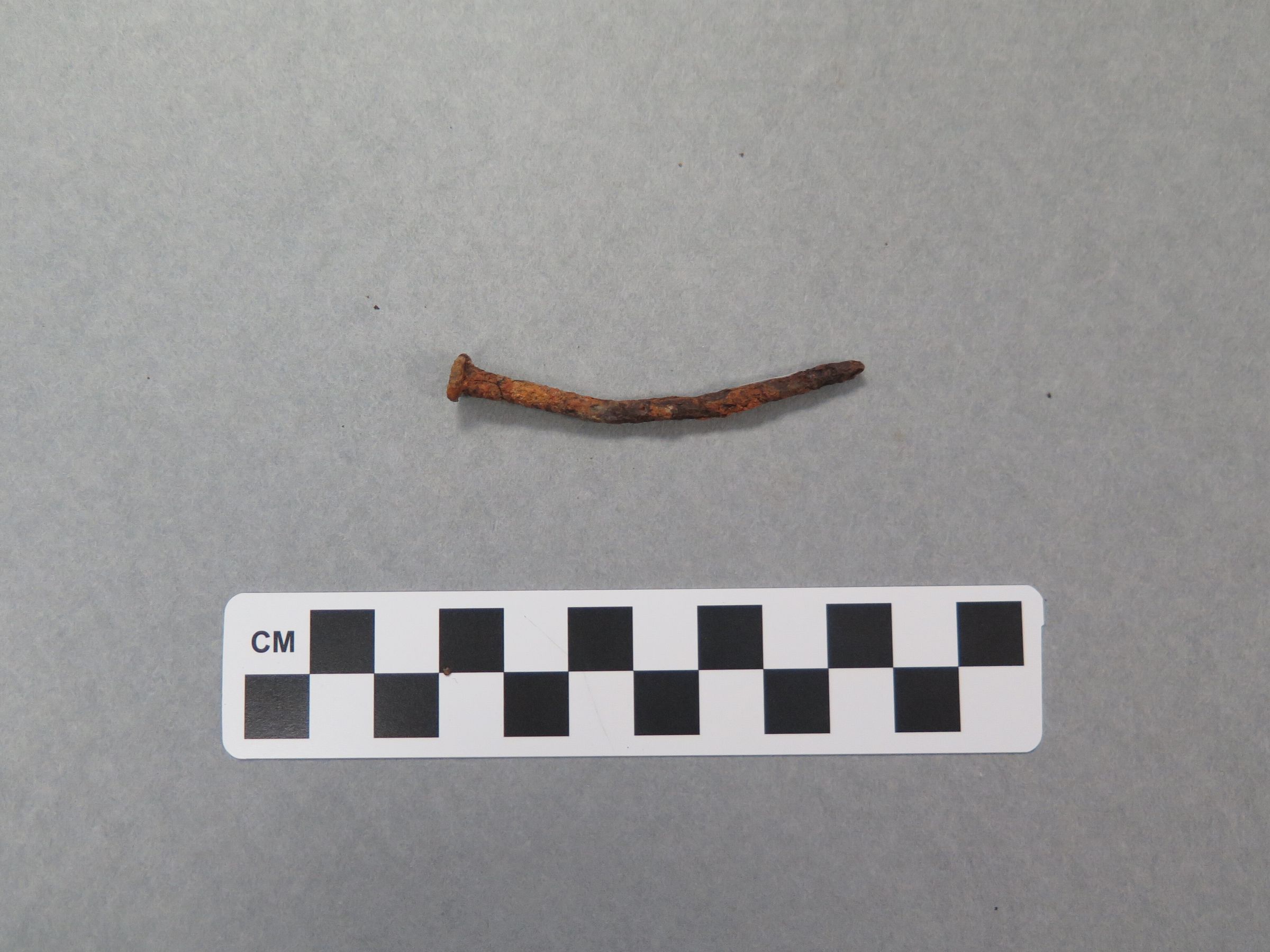 This is a metal nail that is very rusted. The head of the nail is circular as well as the body of the nail. The nail has been warped, as it is no longer straight. The nail measures 2.5" (l) x .25" (diam).