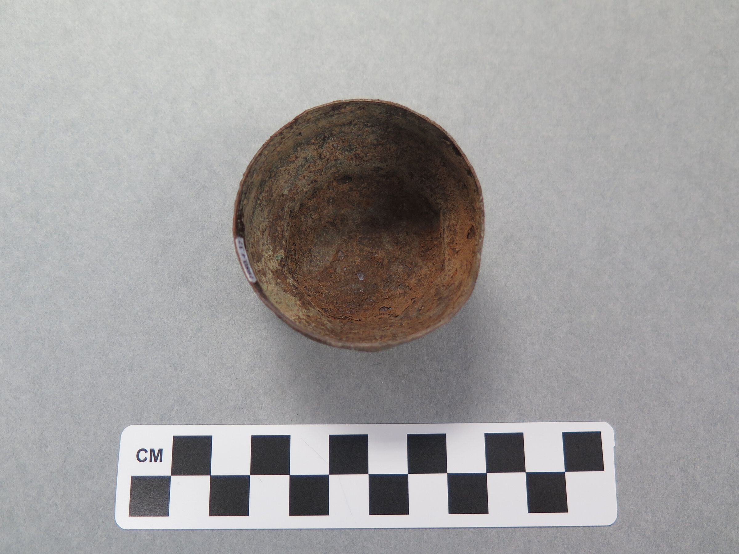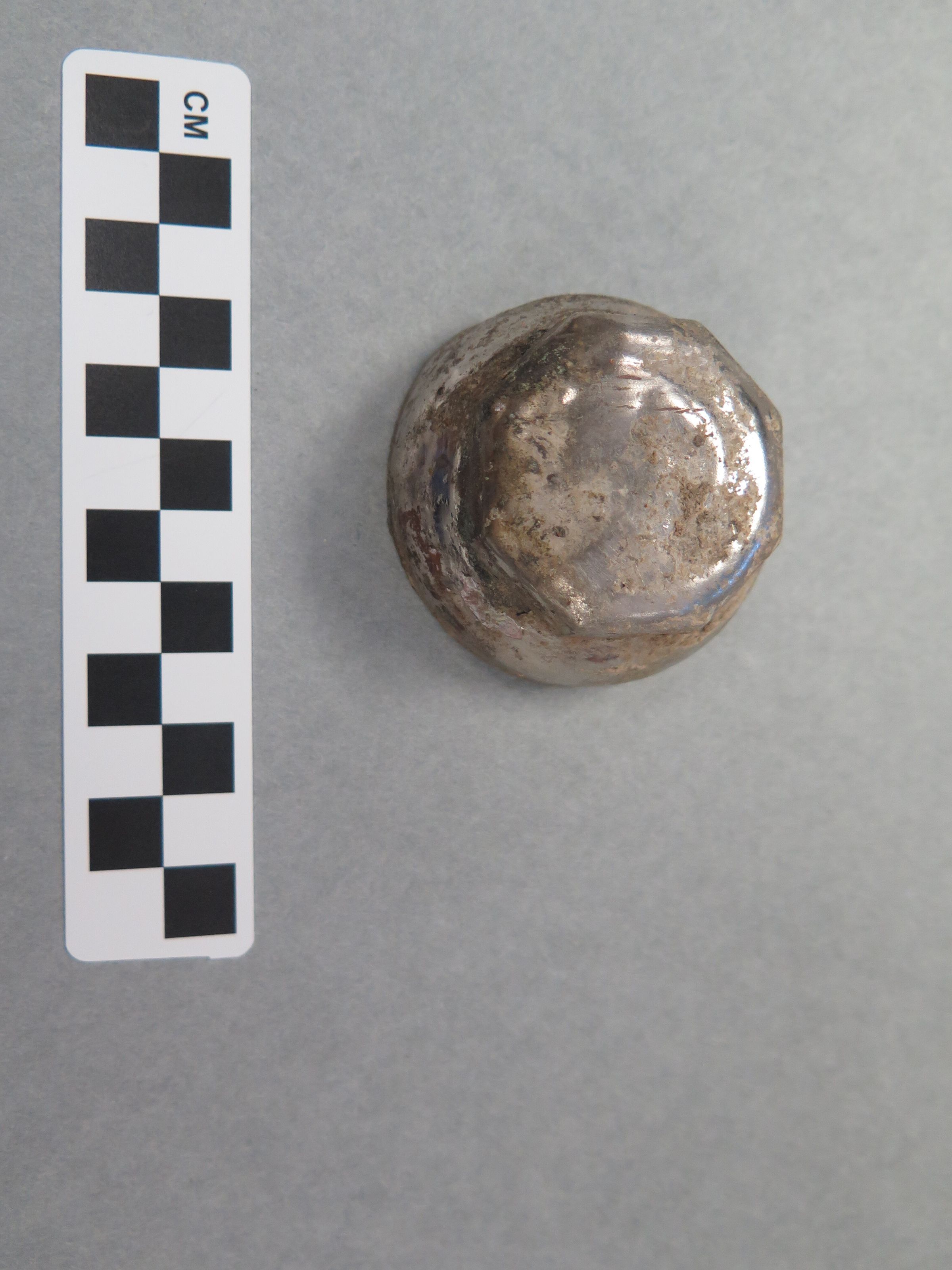 This is a round silver metal lid, that has circular indents on the inside to secure closure. The top of the lid is an octagon. The lid measures 1.25" (h) x 2.25" (diam).Collection