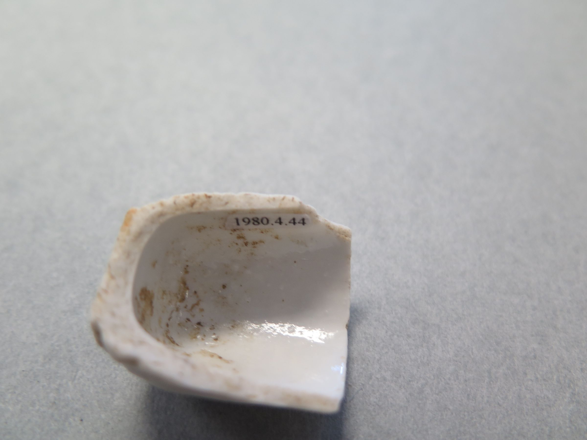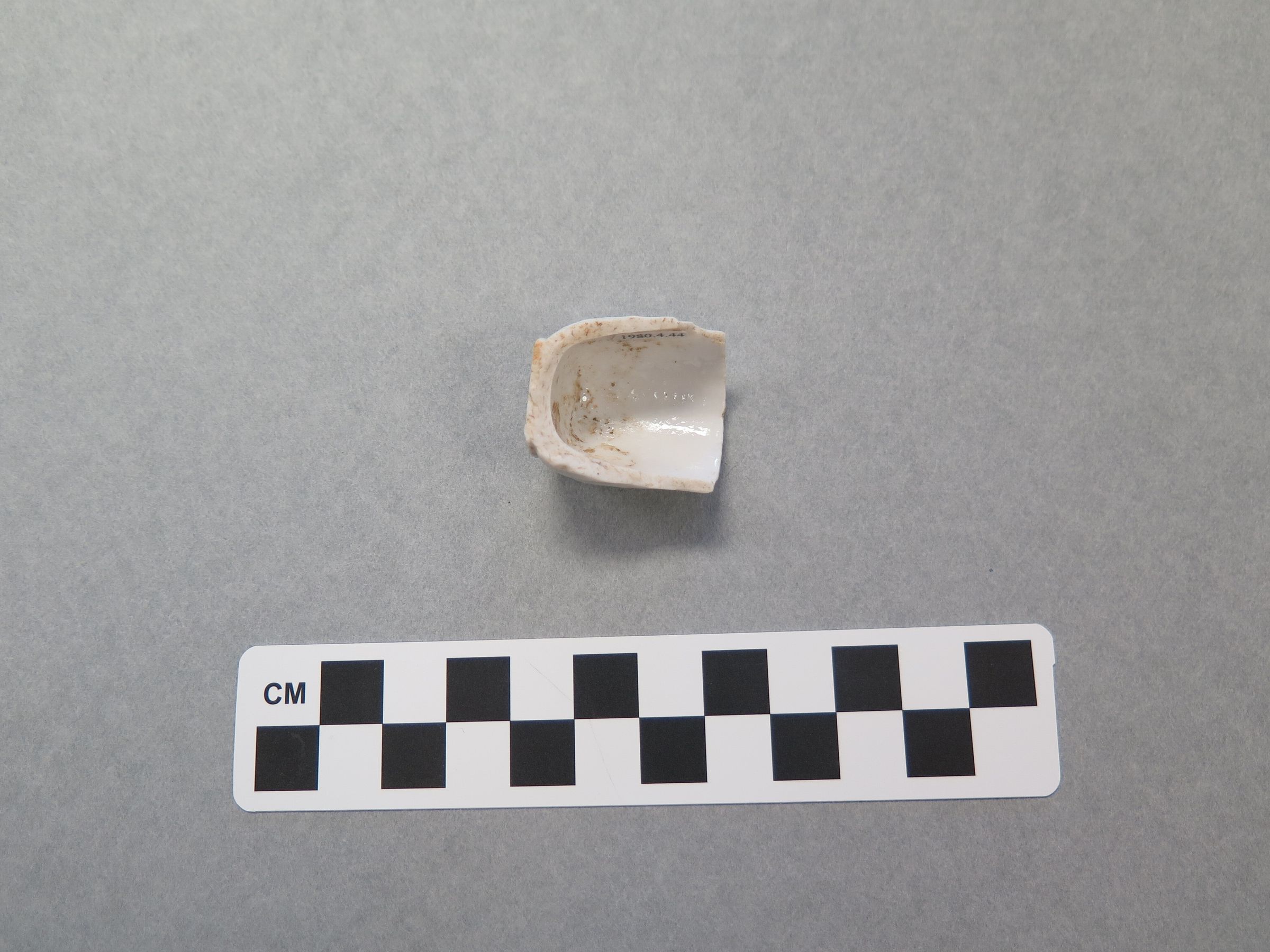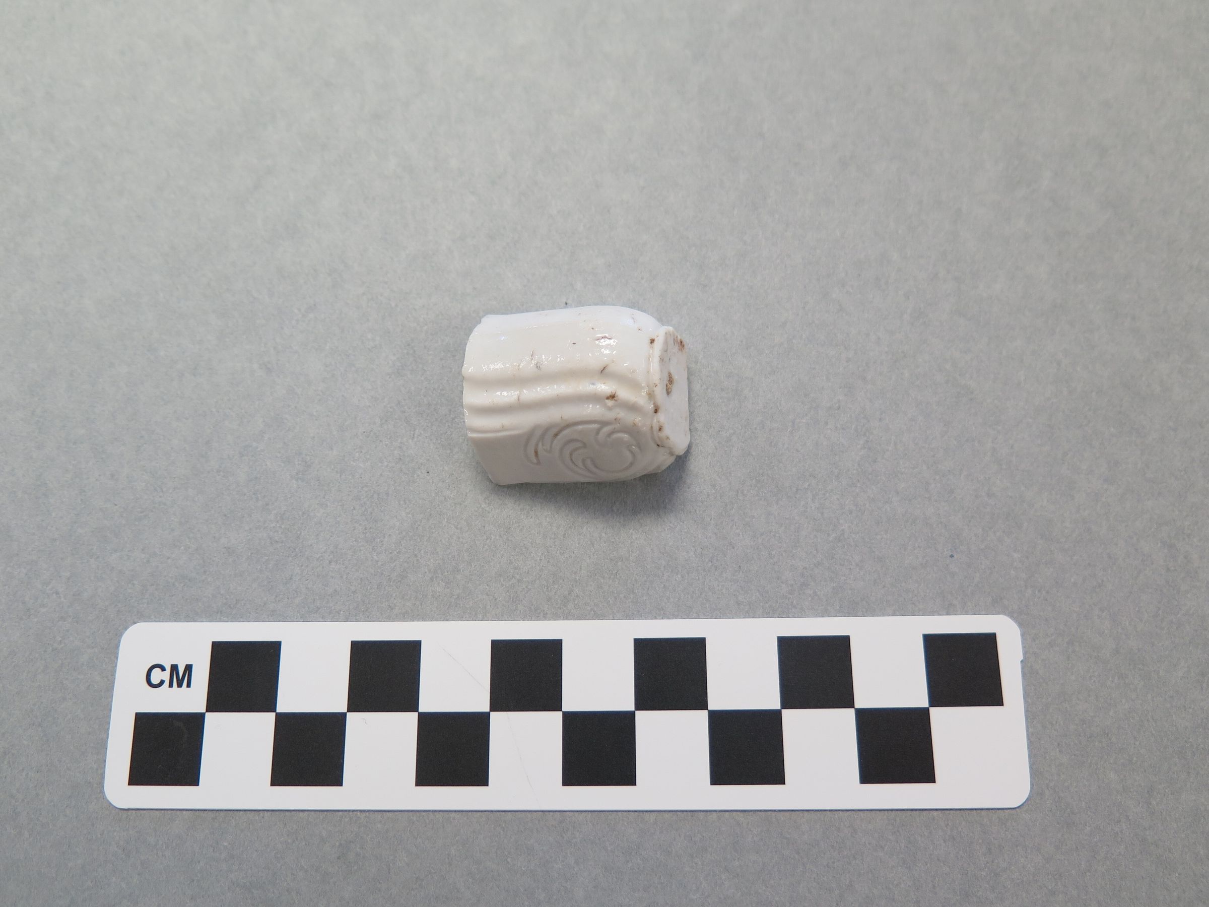 This is a ceramic fragment that is white. It has has a flat bottom and curved edges. There are designs drawn into the fragment before it was fired. It appears to be a container of some sort that held something. The fragment measures 1.25" (h) x 1" (diam).Collection