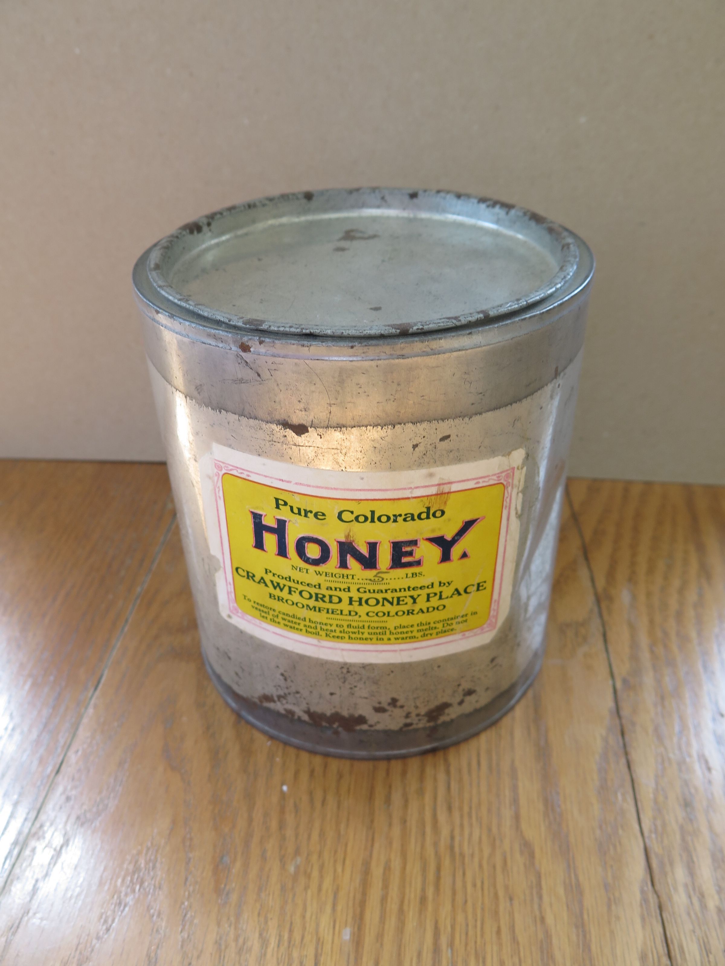 This is a round metal can with a lid, with a Crawford family honey label pasted to the front of the can. This label reads "Pure Colorado Fancy Grade Honey Net weight 5 lbs Produced and Garuneteed by Crawford Honey Place Broomfield, Colorado." The can measures 5.5" (h) x 5" (diam).Collection