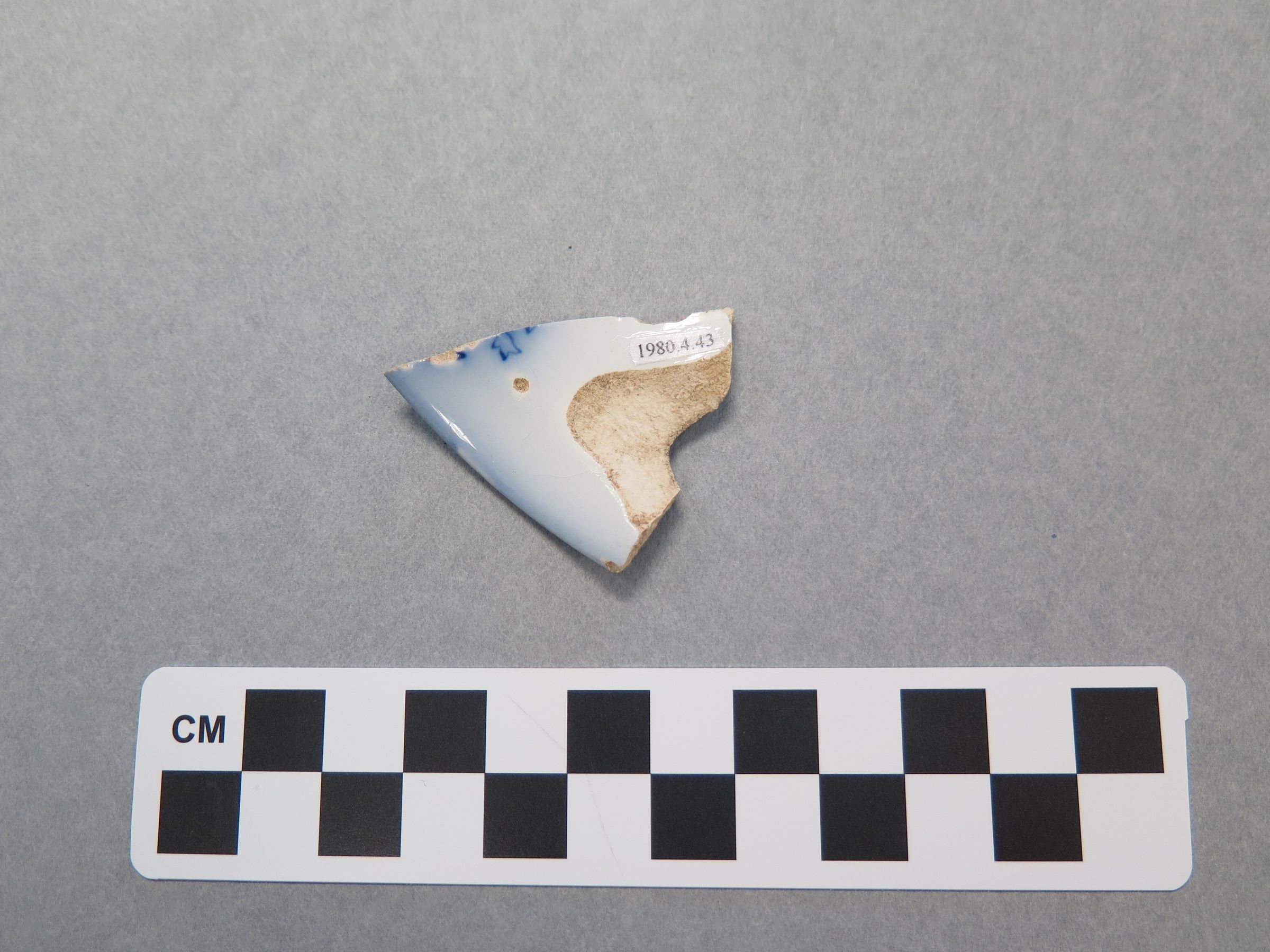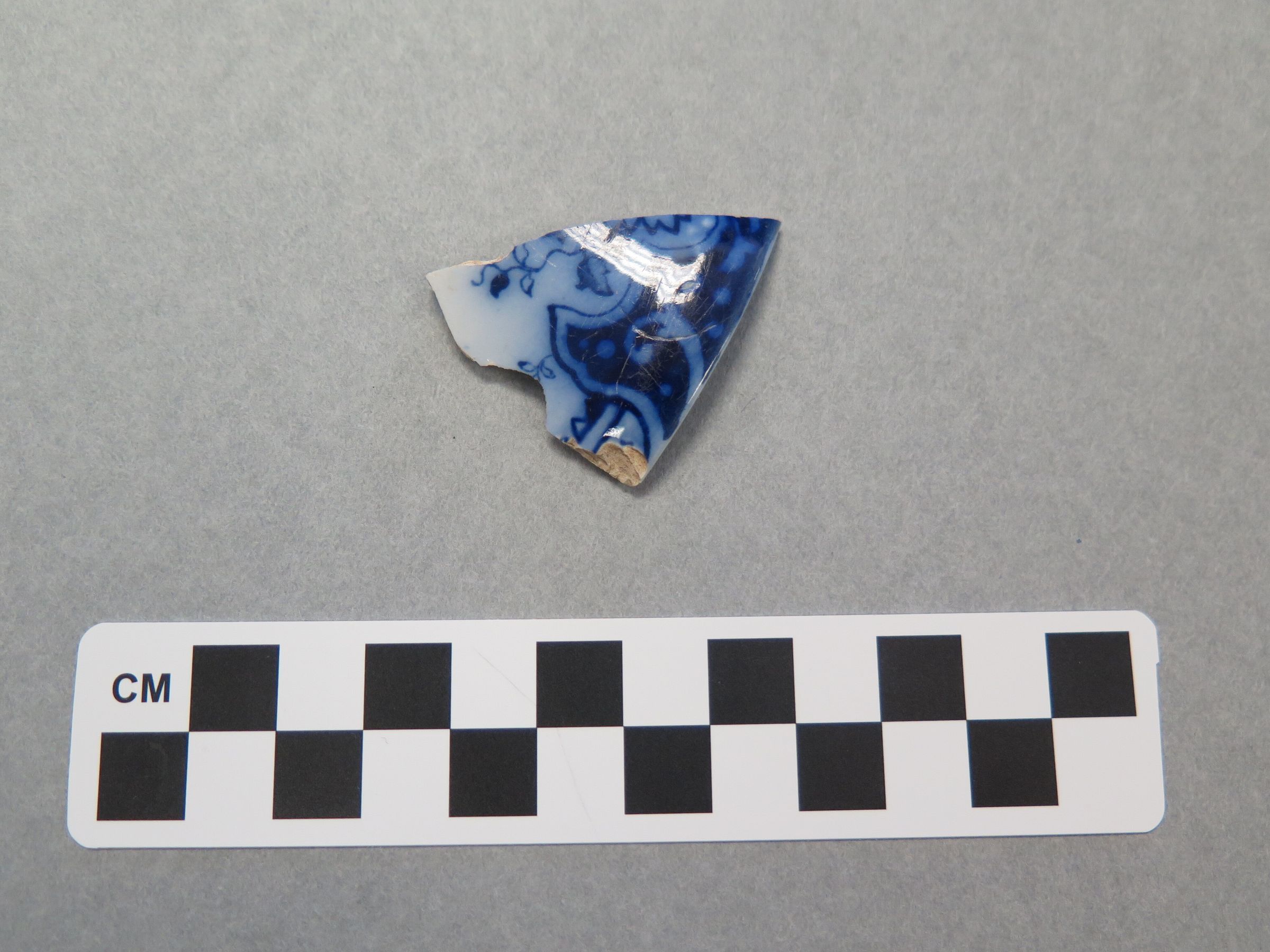 This is a ceramic fragment that is glazed white. The fragment is of the edge of the saucer, it has a straight edge. There are some blue glazed details on the front of the fragment and the bottom of the fragment is highly decorated with blue glazed designs. The fragment measures .25" (h) x 1.75" (w) x 1.5" (l).Collection