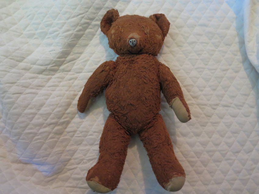 This is a brown stuffed teddy bear with tan pads on all 4 paws. The bear is missing both eyes and has a black nose. The bear measures 7.5" (w) x 11" (l) x 3.5" (d).Collection