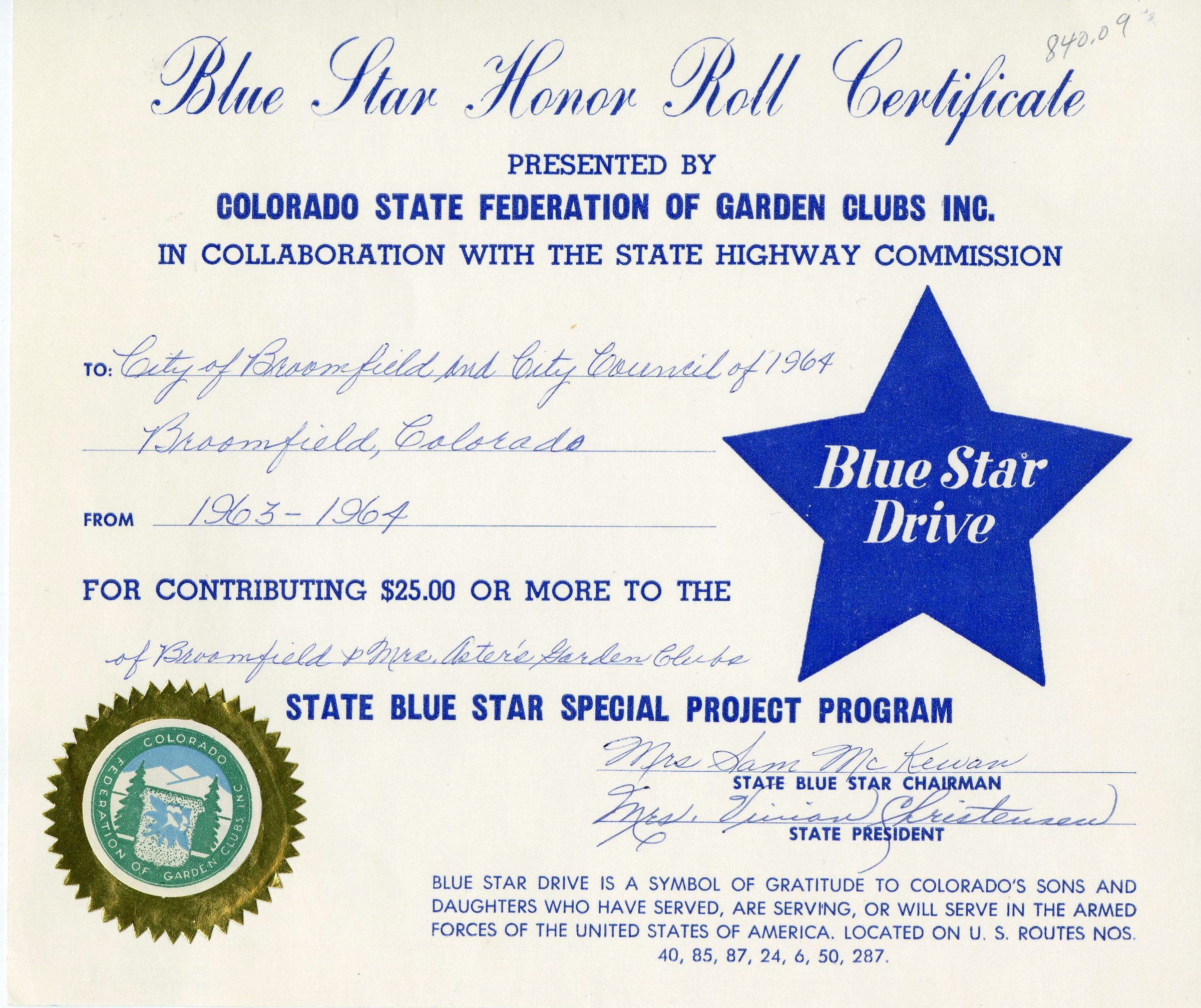 State Blue Star Special Project Program certificate presented by Colorado State Federation of Garden Clubs Inc.