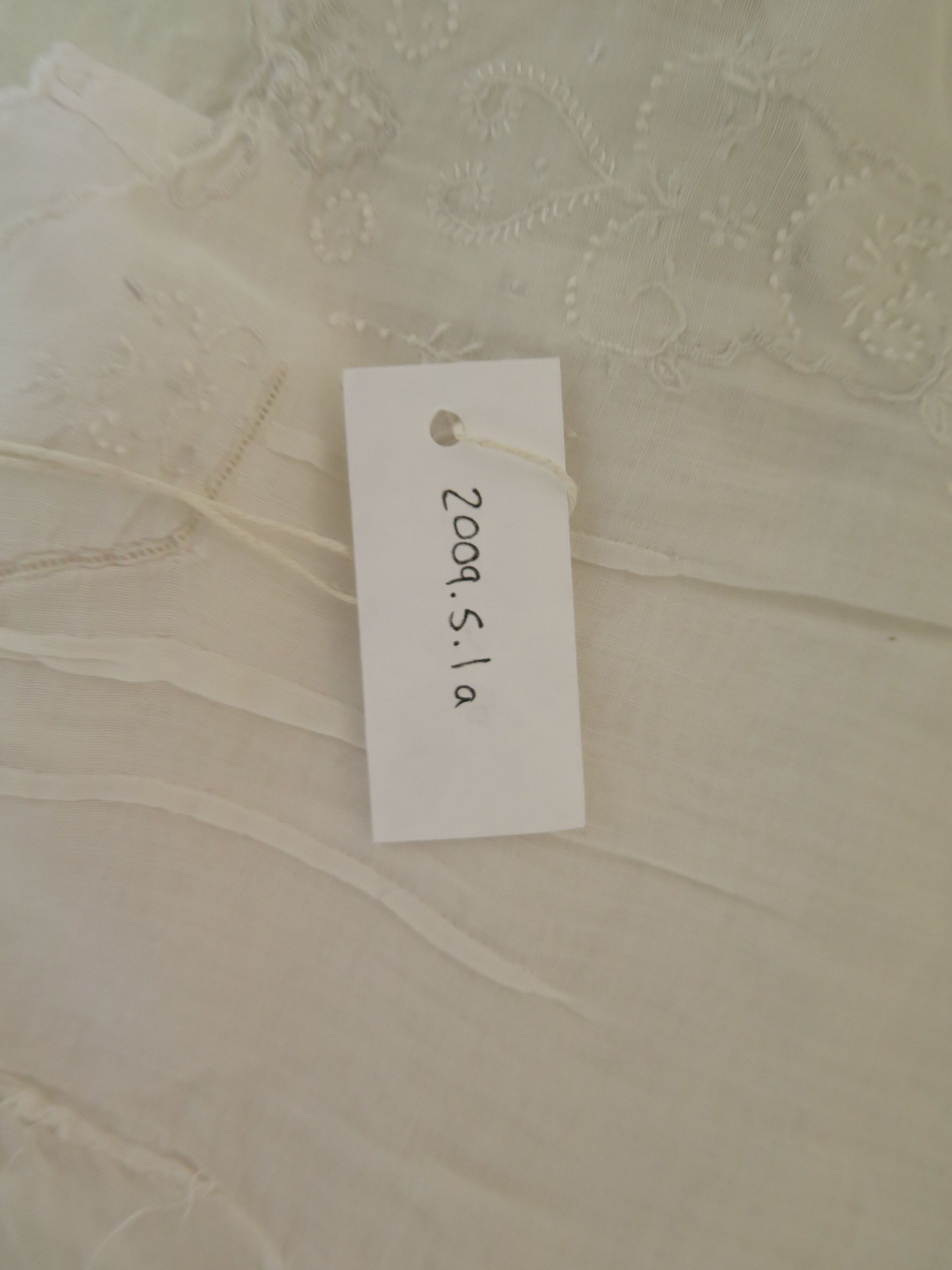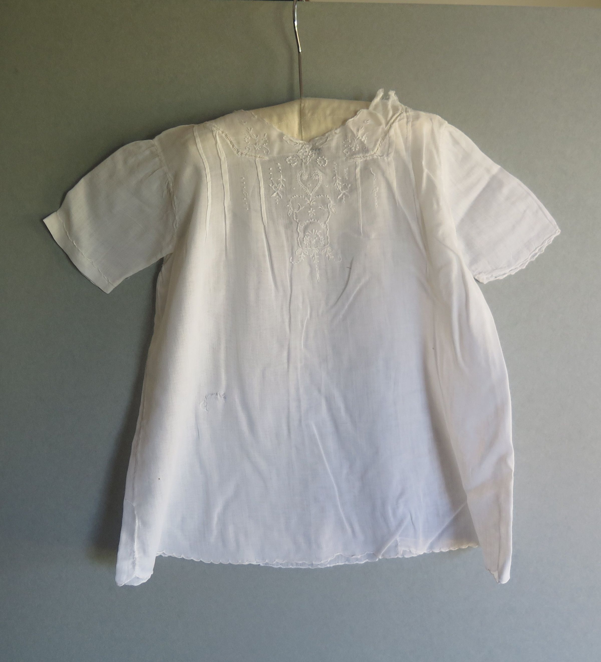 Baby's white dress c. 1910. There is a floral embroidery detail at the neckline as well as small pleats. The dress measures 14" (w) x 18" (l).