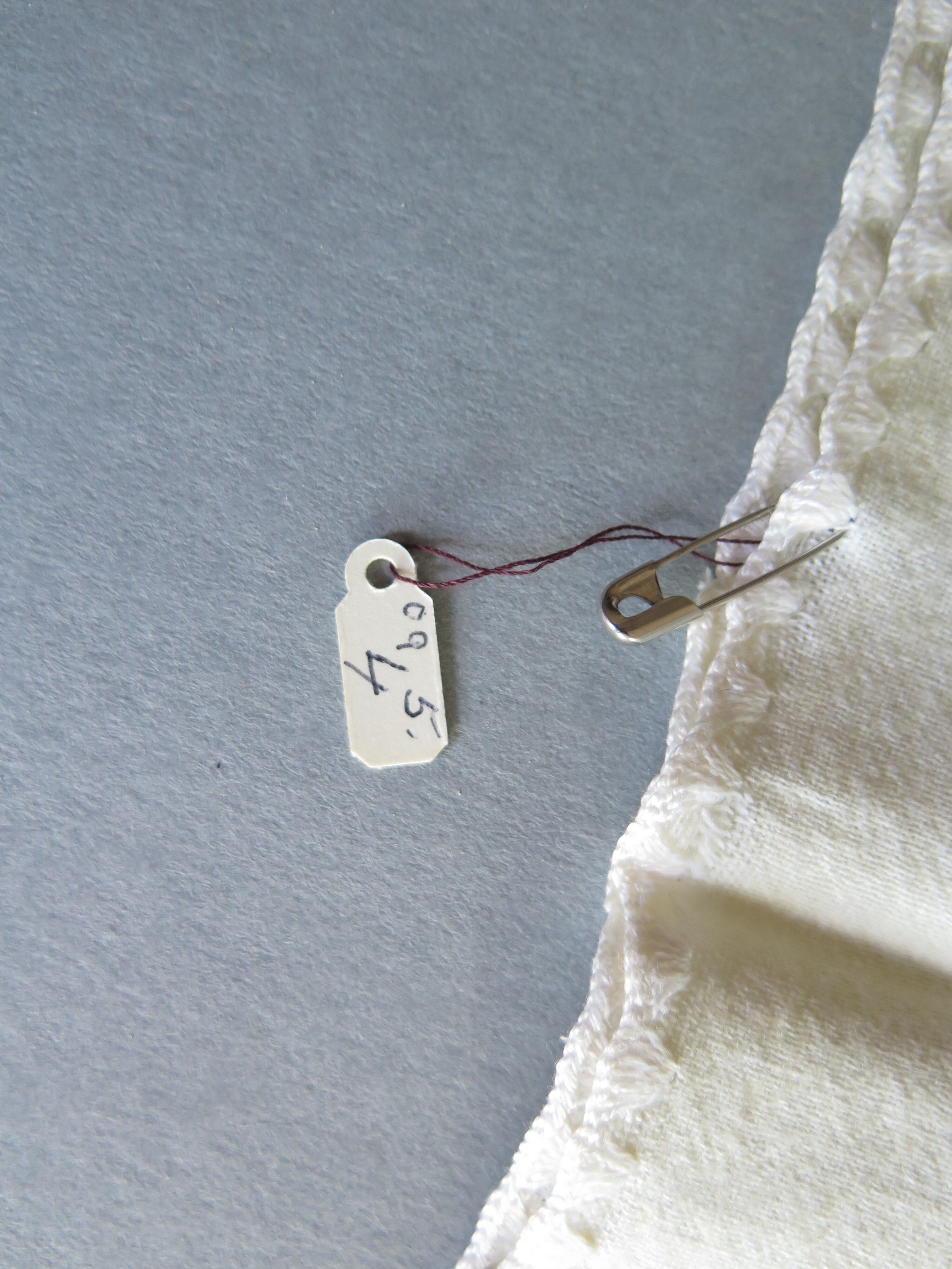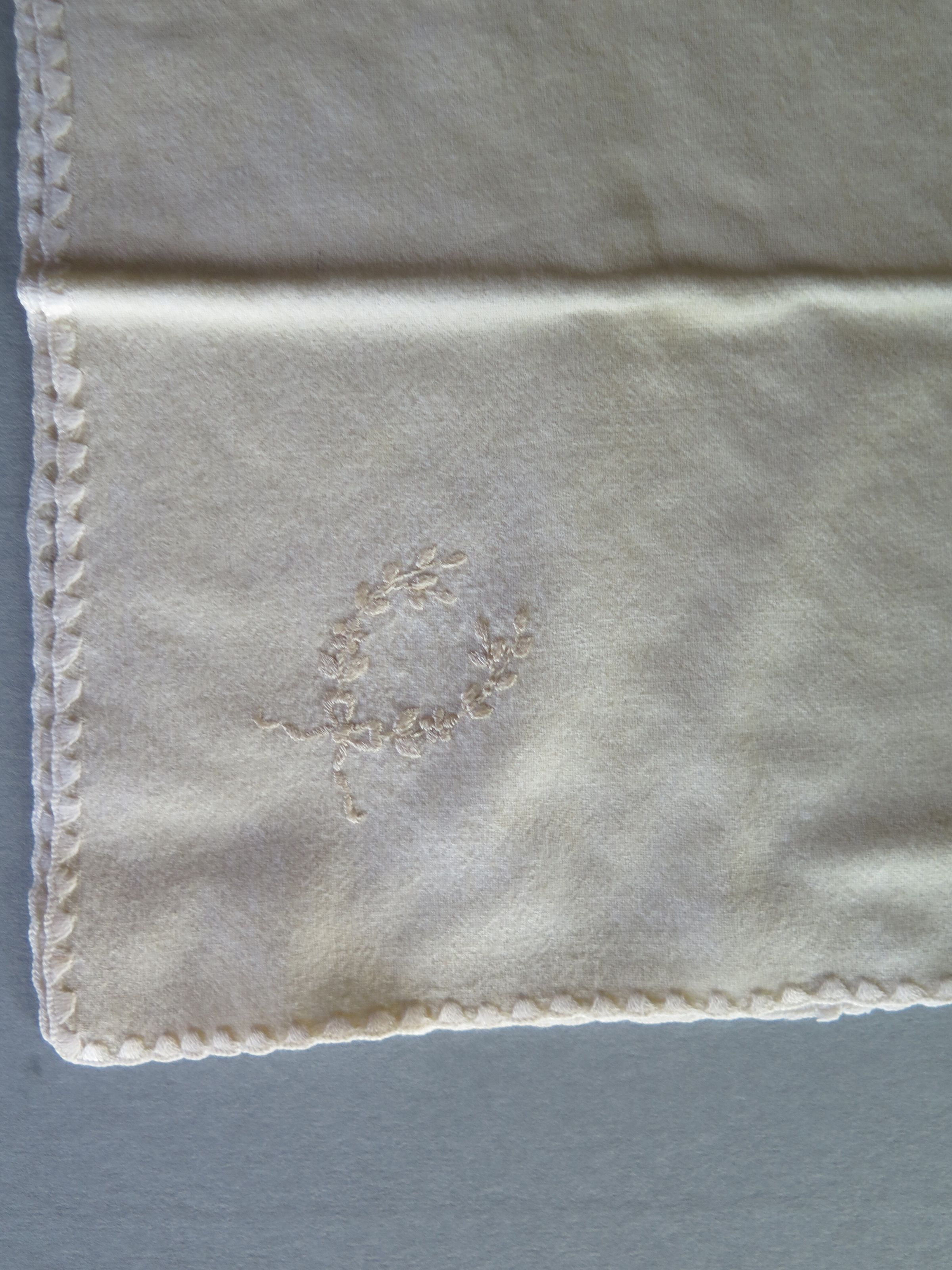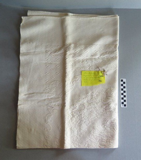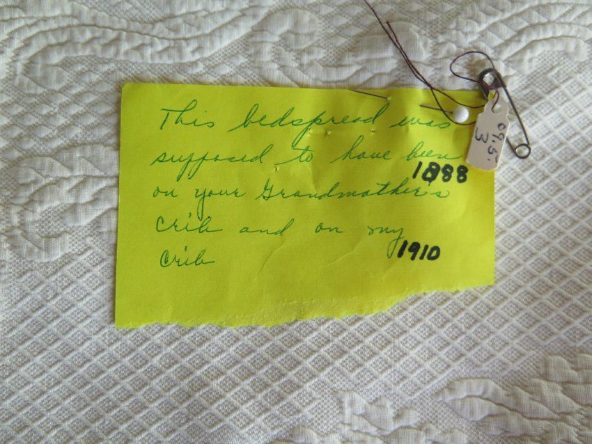 White crib spread, c. 1888. There is a floral design in the texture of the bedspread. The note on the bedspread reads "This bedspread was supposed to have been on your Grandmother's (1888) crib and on my (1910) crib." The bedspread measures 24" (w) x 64" (l).Collection