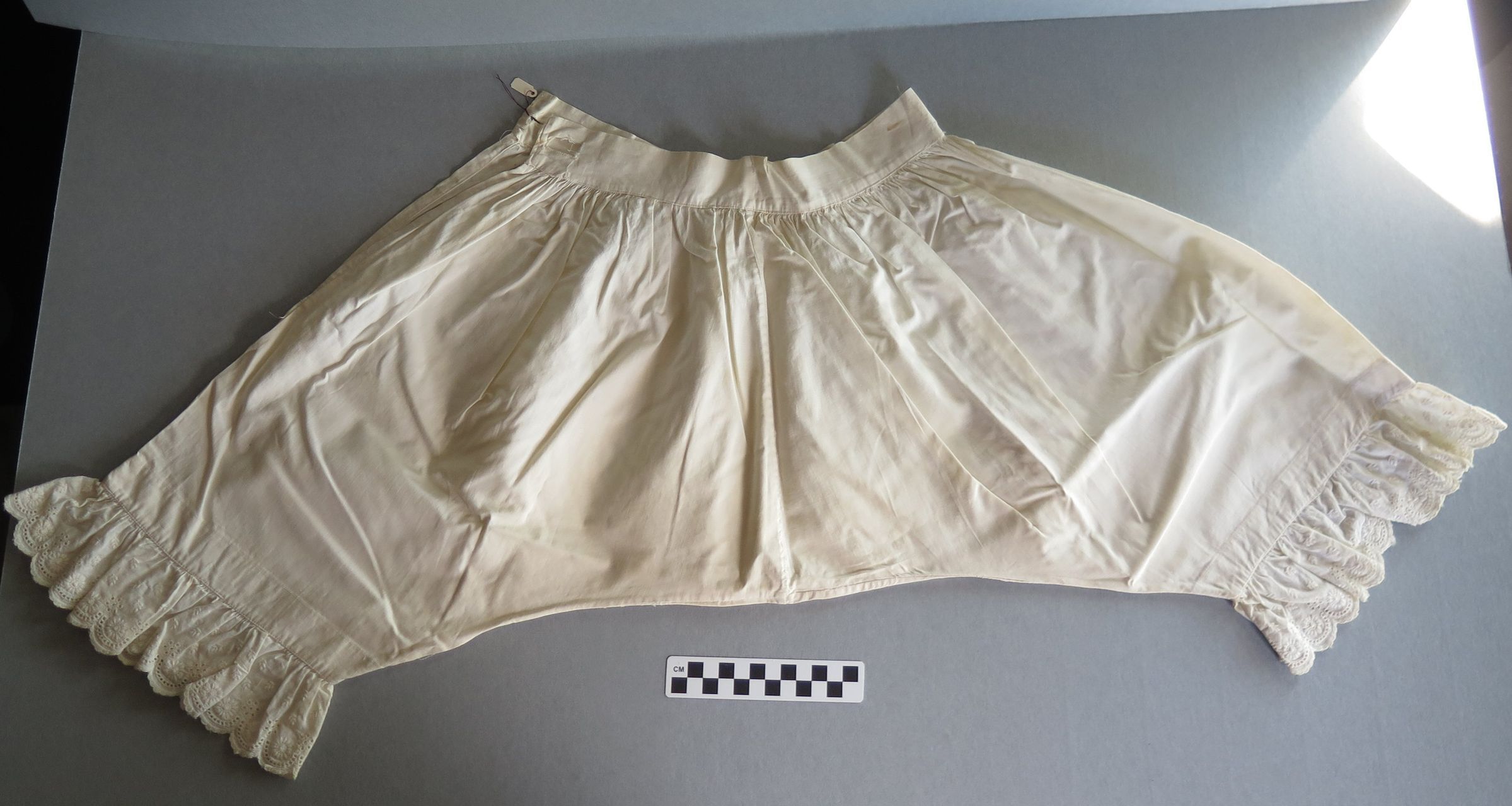 Women's white bloomers c. 1910. The bottom of each leg is scalloped. There are buttons at one side at the hip to close the bloomers. The bloomers measure 13" (w) x 18" (l).