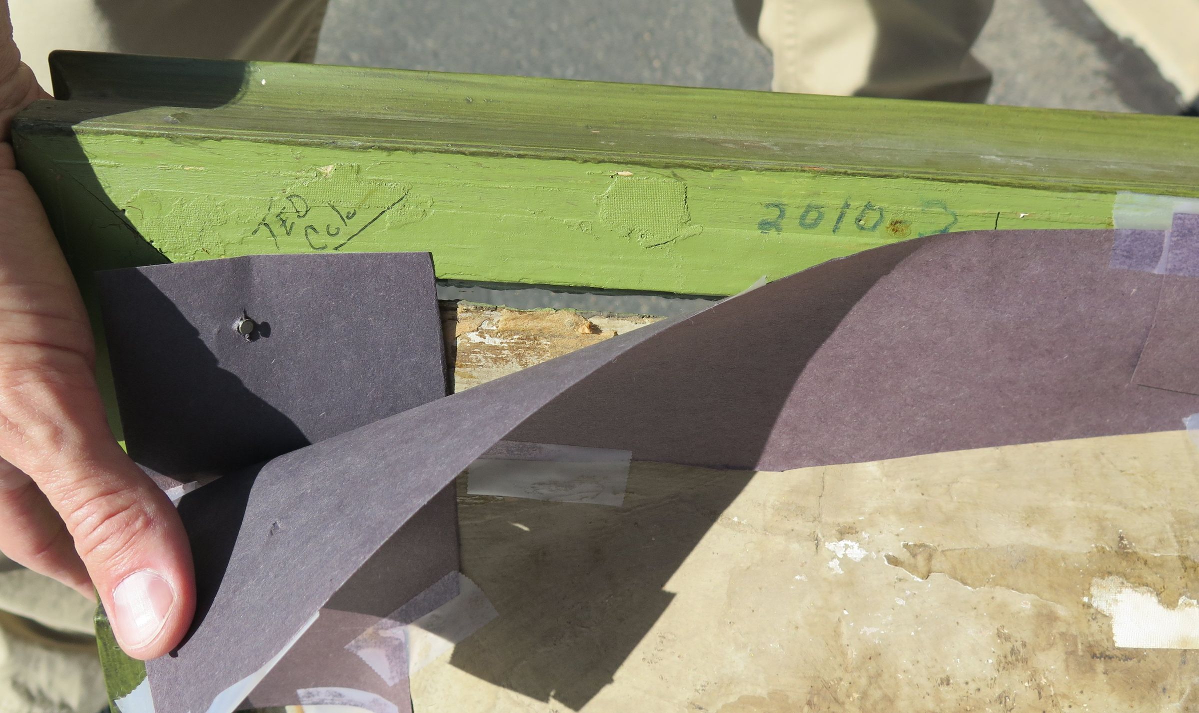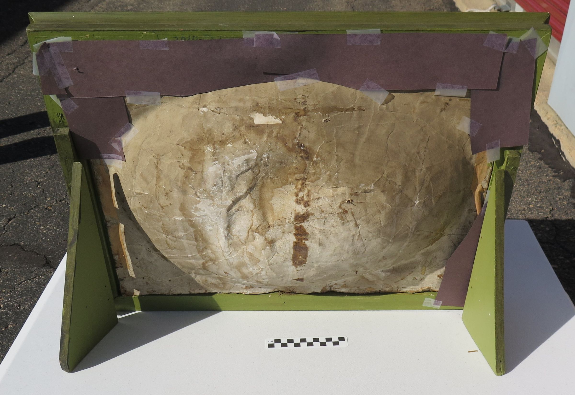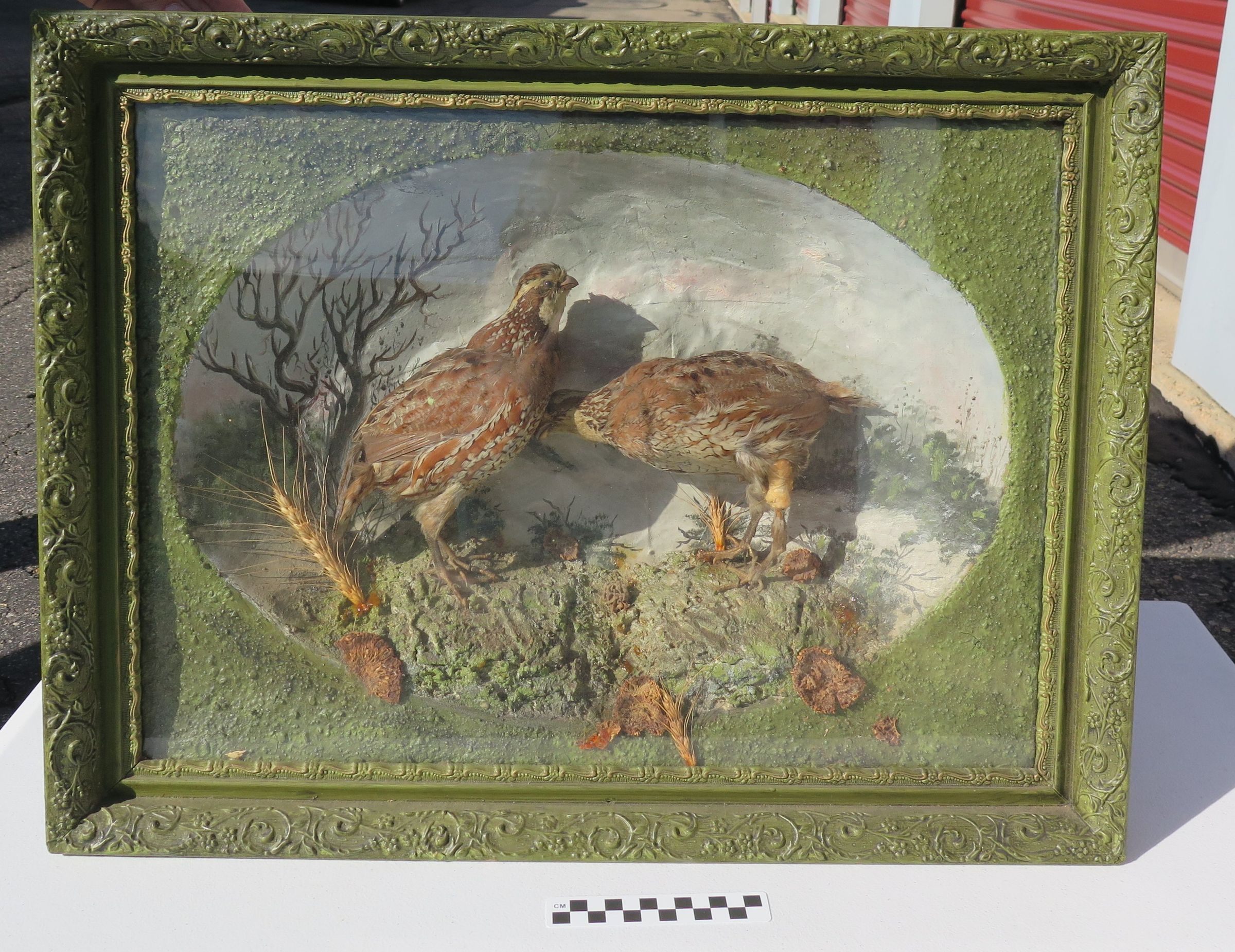 Diorama of two birds in green frame. This is a wooden frame that has been painted green. Inside the frame is a quail diorama featuring two taxidermy quail. The back of the frame is covered in a paper mache like material, which keeps the quail inside. There is text on the back of the frame that reads, "TED Cole"