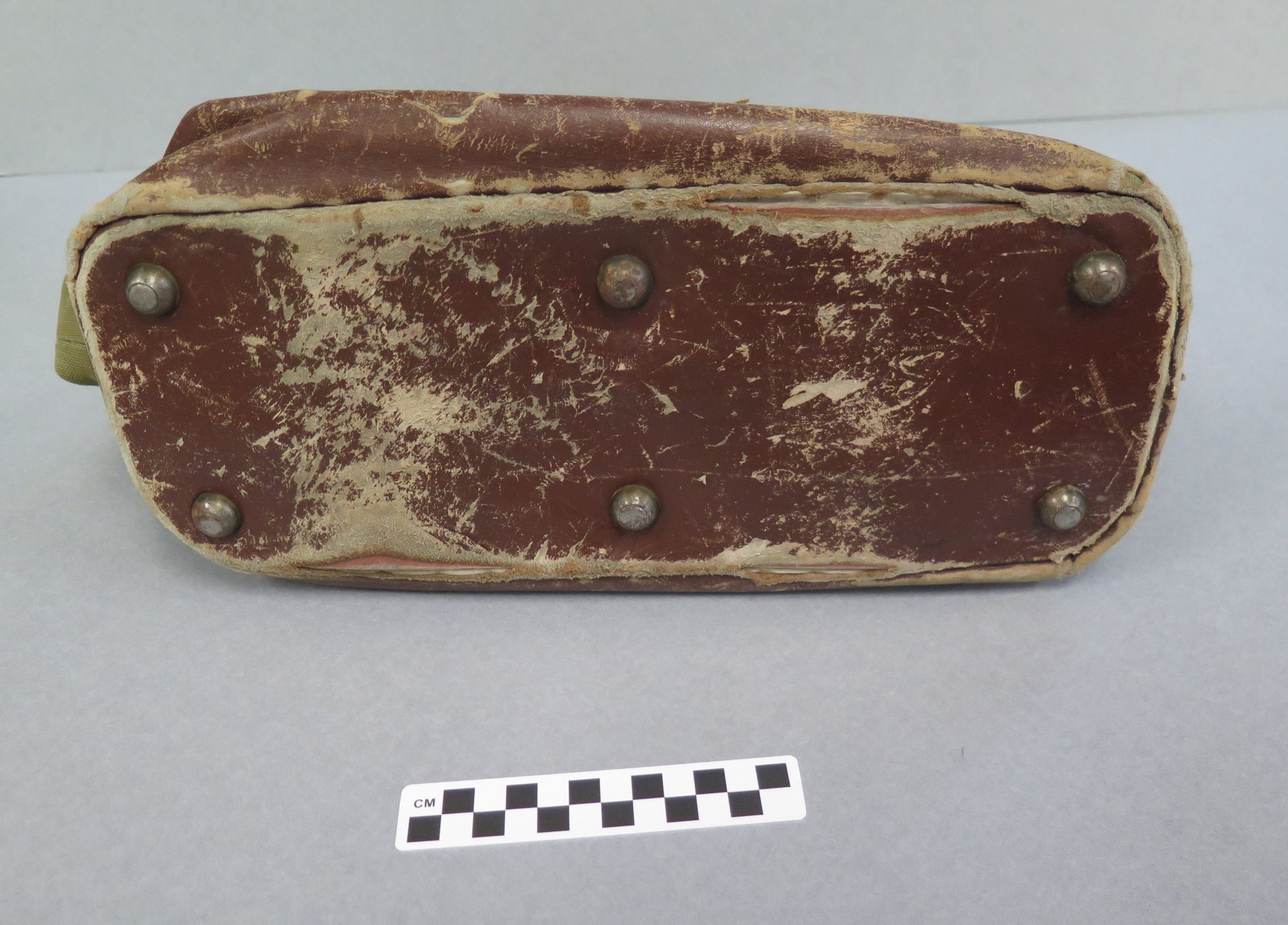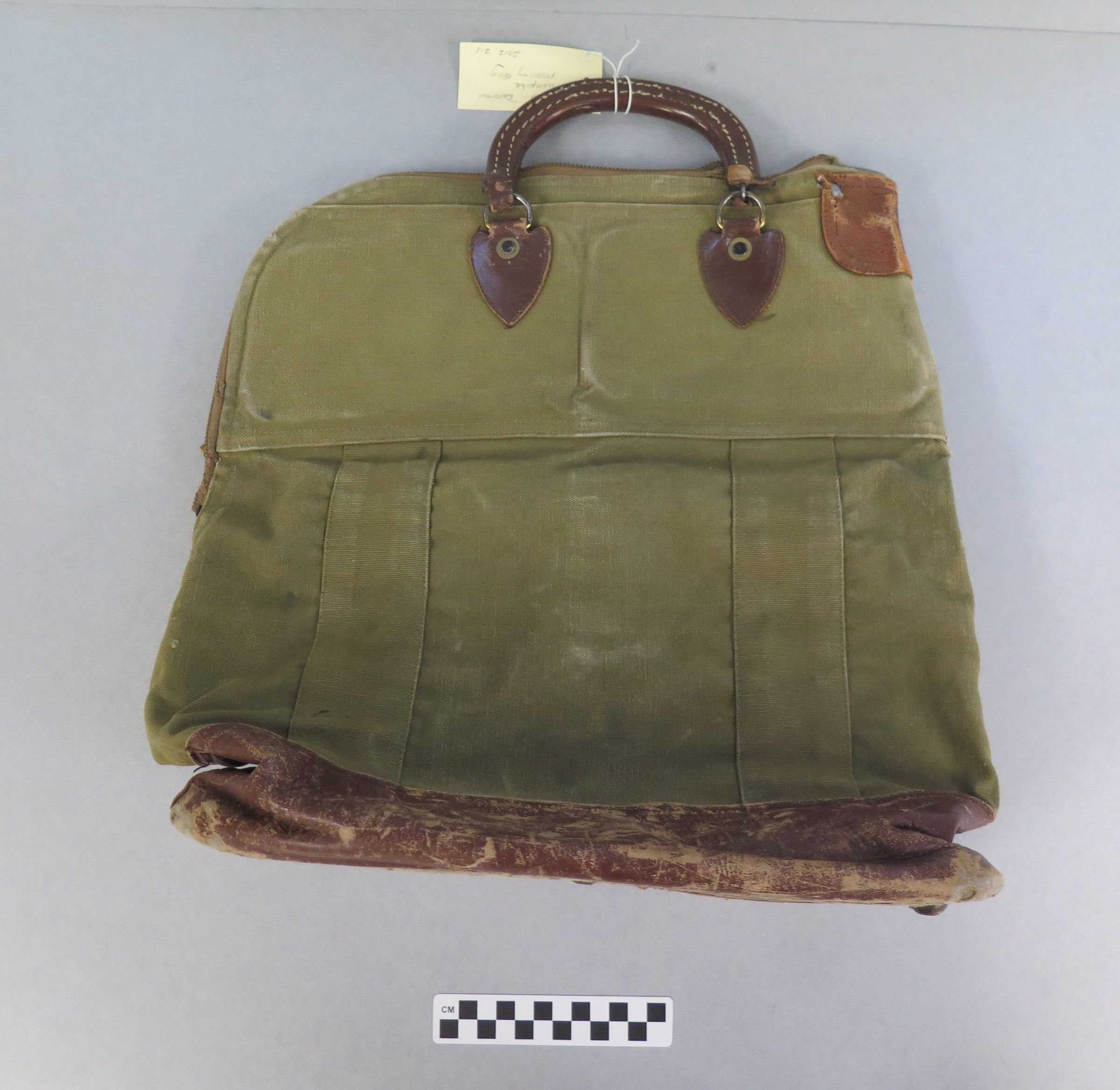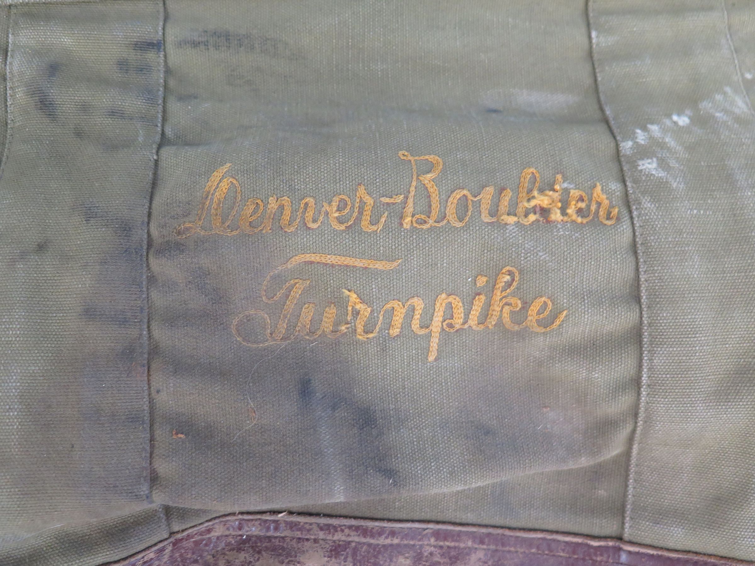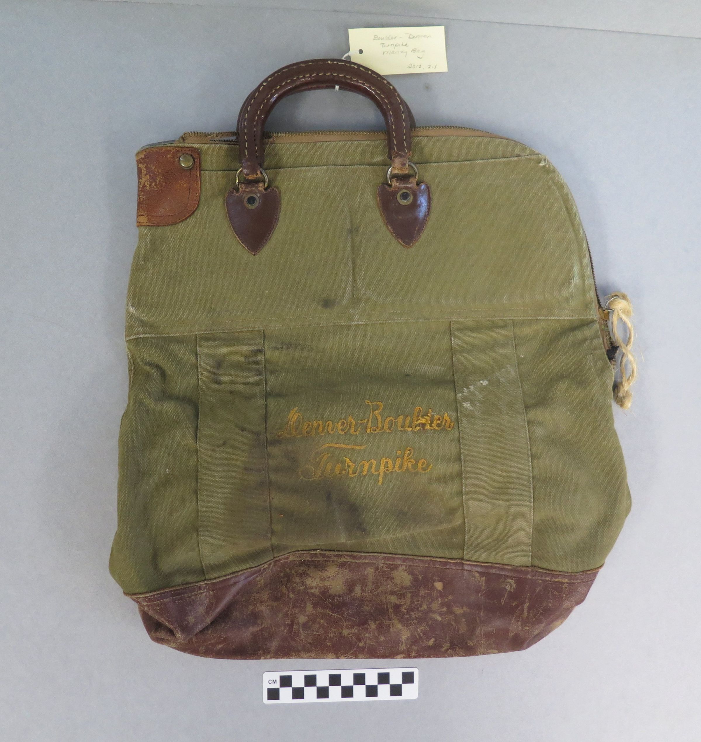 This is a canvas and leather money bag used by the Denver-Boulder Turnpike (U.S. Highway 36) to collect tolls. The bag is made of green canvas with leather around the base, on the handles, and on the top left corner where the locking mechanism is. The bag has the text " Denver-Boulder/ Turnpike" embroidered on the front in yellow thread. The bottom of the bag has 6 metal rivets to help reinforce the bag when it is full of change. There is a cardboard handle on either side of the bag that is covered in leather. The handles are held on by metal loops. The bag zips on the right side across to the left, where a locking mechanism is present. There is a 4" (l) loop of twine hanging from the loop on the zipper. The bag measures 17" (h) x 16" (w) x 6.5" (d).Collection