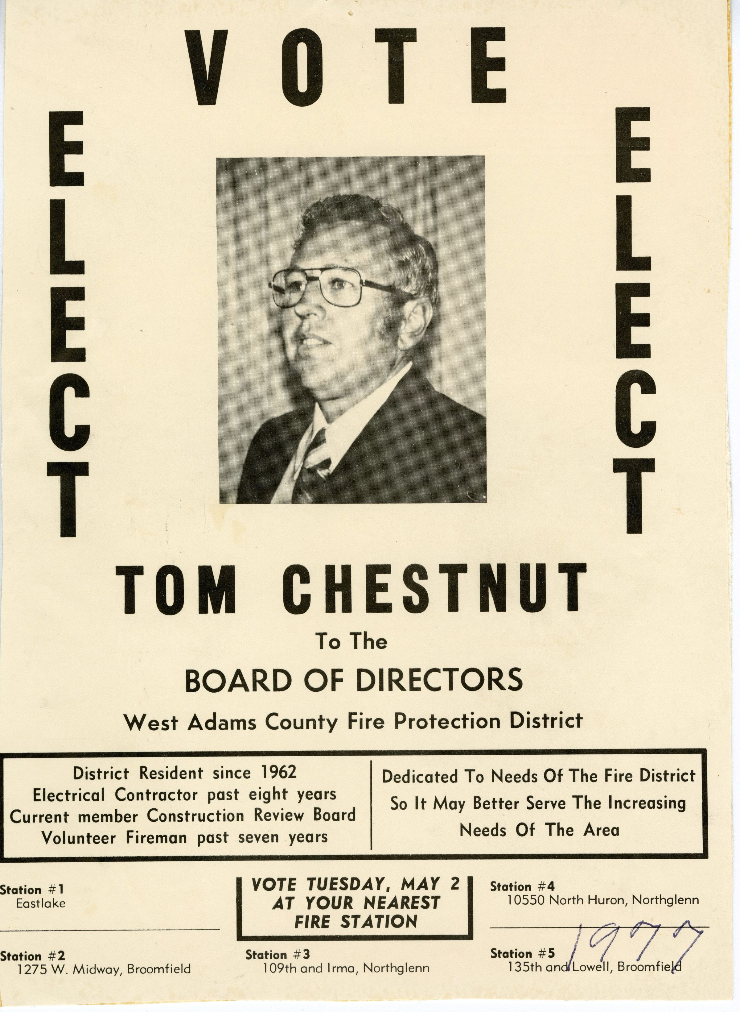 1977 Board of Directors West Adams County Fire Protection District campaign poster for Tom Chestnut. Vote on May 2, 1977 at five station locations - Station #1 Eastlake, Station #2 1275 W. Midway, Station #3 109th and Irma, Northglenn, Station #4 10550 North Huron, Northglenn, Station #5 135th and Lowell. Poster is on beige cardstock, black print, showing black and white photograph of Tom Chestnut. Notes that he has been: District resident since 1962, Electrical contractor for 8 years, current member of the construction review board, volunteer fireman for 7 years, "Dedicated to needs of the fire district so it may better serve the increasing needs of the area."Collection