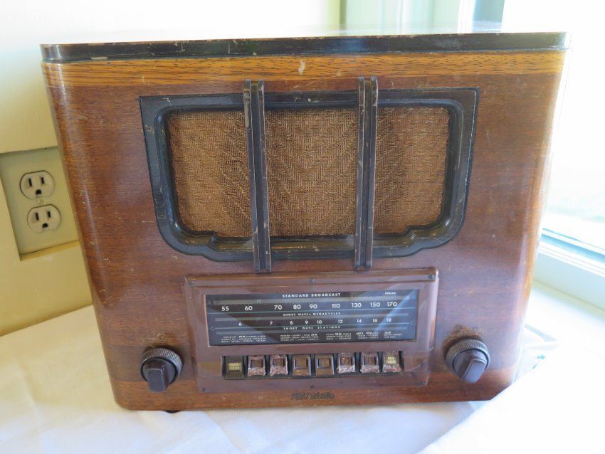 This is a wood shortwave standard broadcast RCA-Victor radio from 1937-1938. The radio has 2 knobs on the front. The radio measures 12.5" (h) x 14.75" (w) x 8.25" (d).