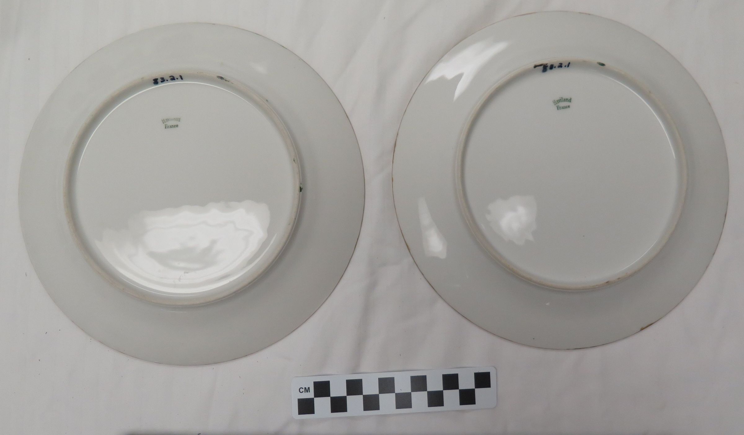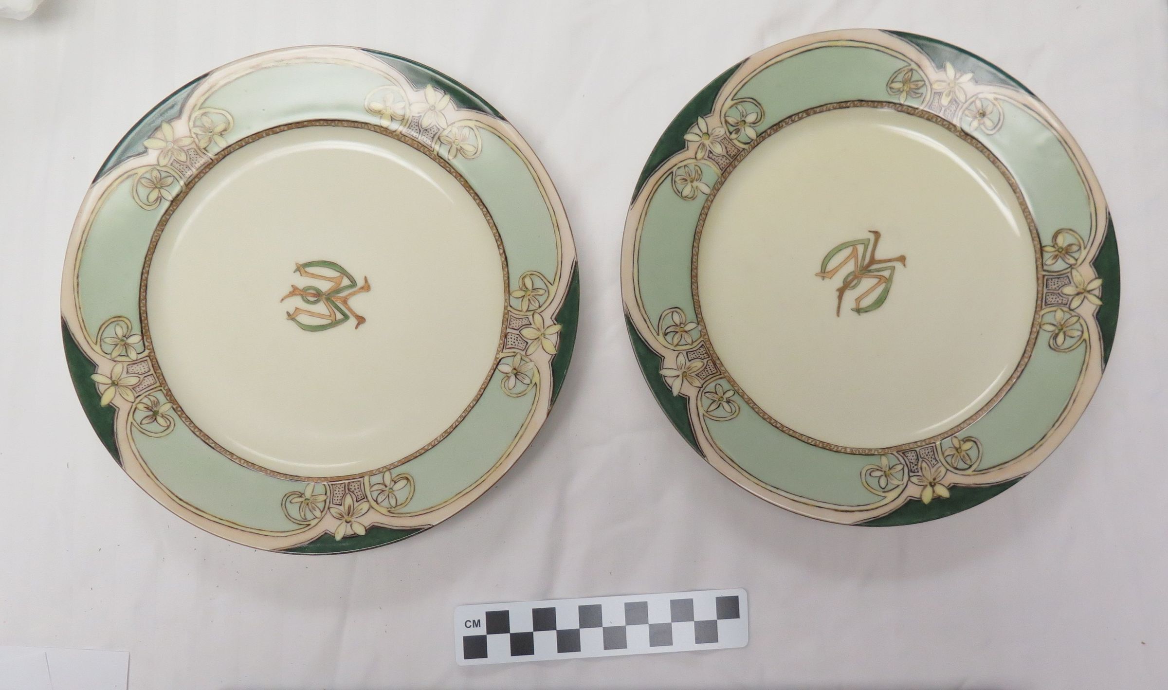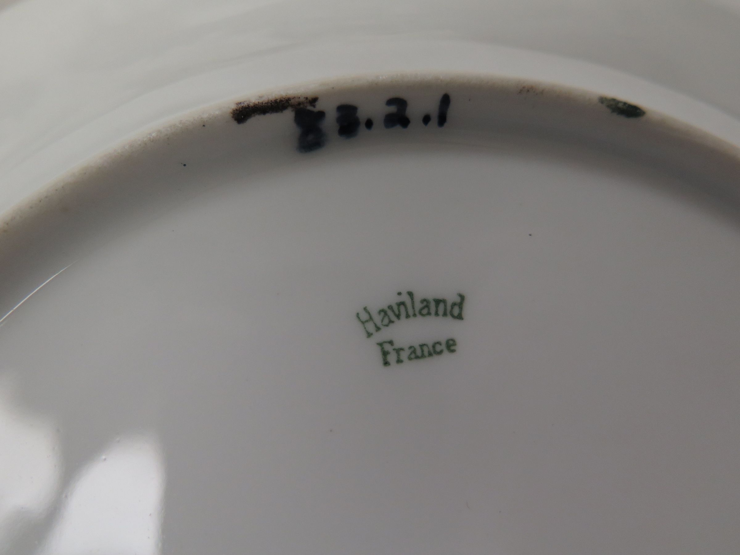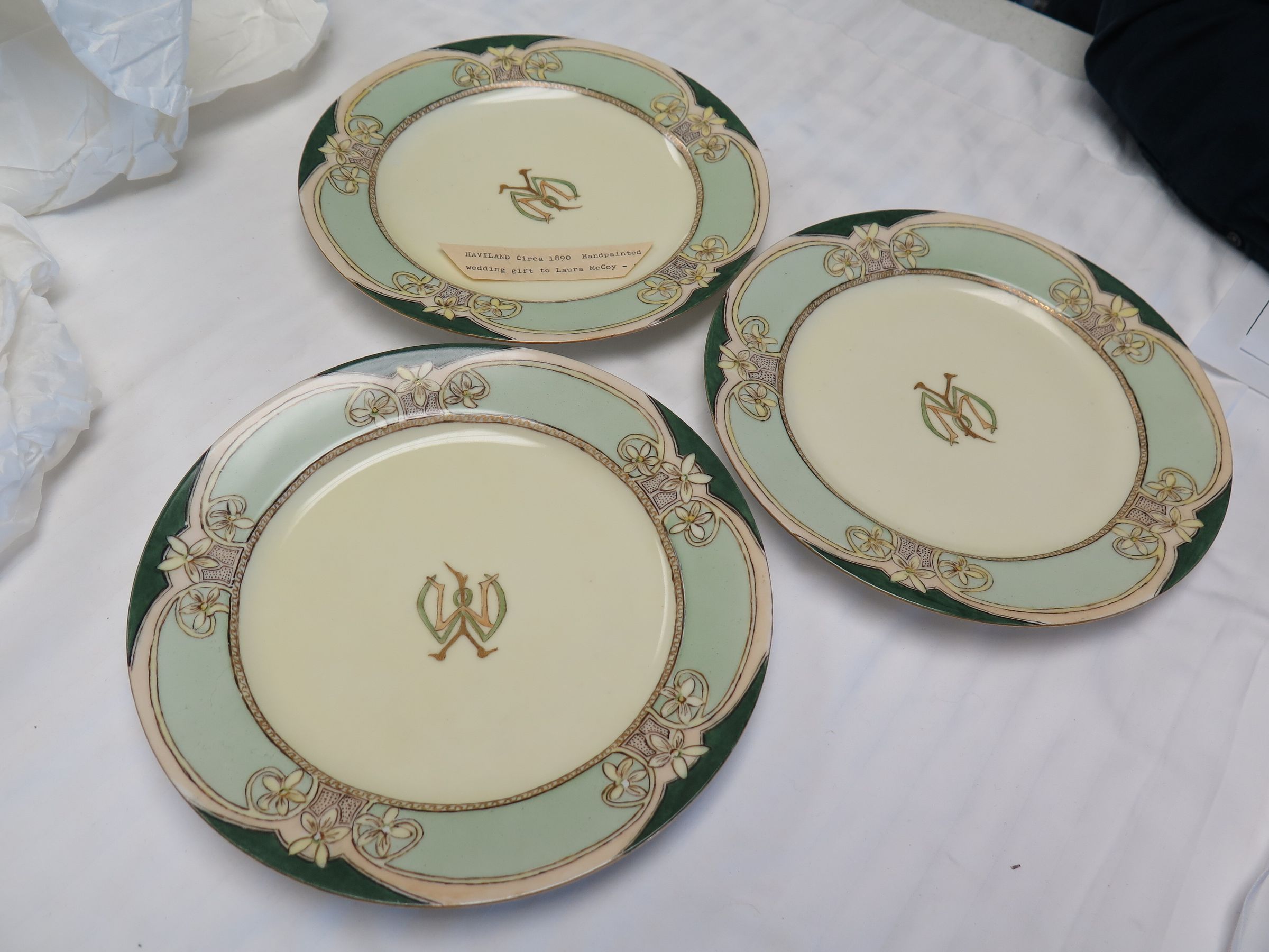 This is a set of 5 Haviland plates with a green border and a design in the center. One of the plates has a note indicating that the plates were handpainted. Each plate measures 8.5"(Dia).