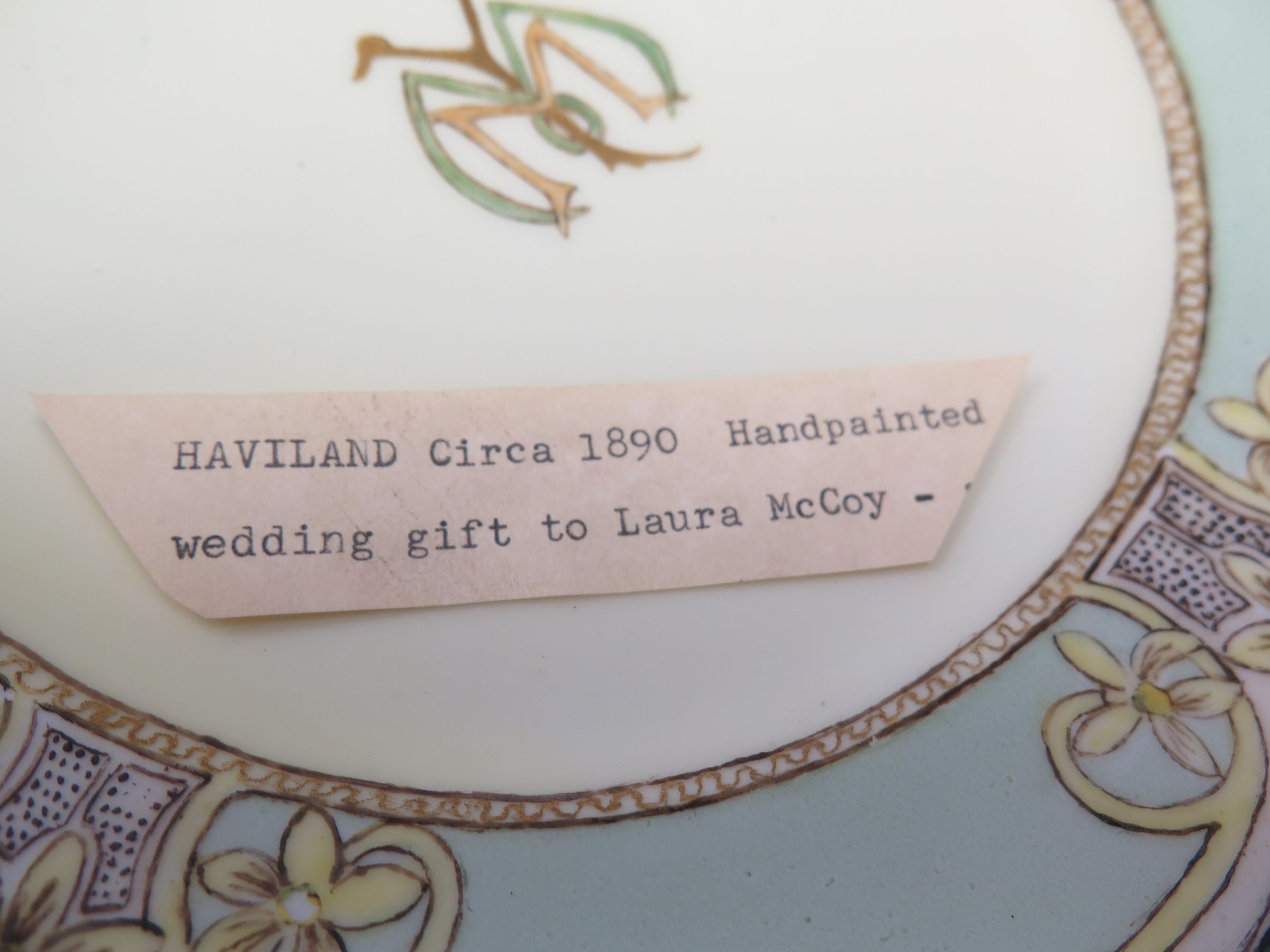 Donor's grandmother's wedding gift. Probably hand painted. Laura McCoy Adams about 1890s.